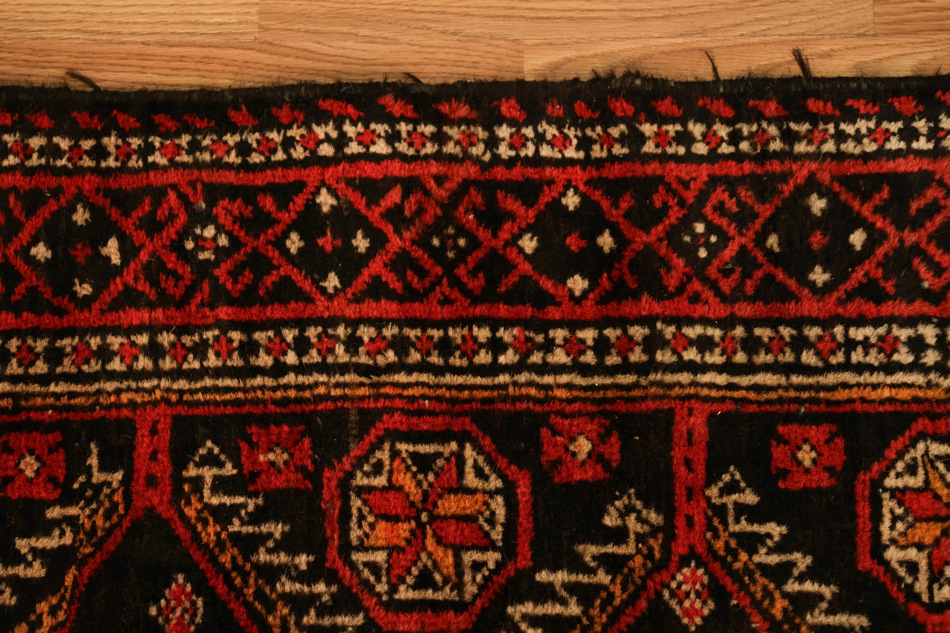 An inviting geometric area rug with deep, sultry red color palette. Finished with fringe on either end. In good condition with some light surface wear throughout.