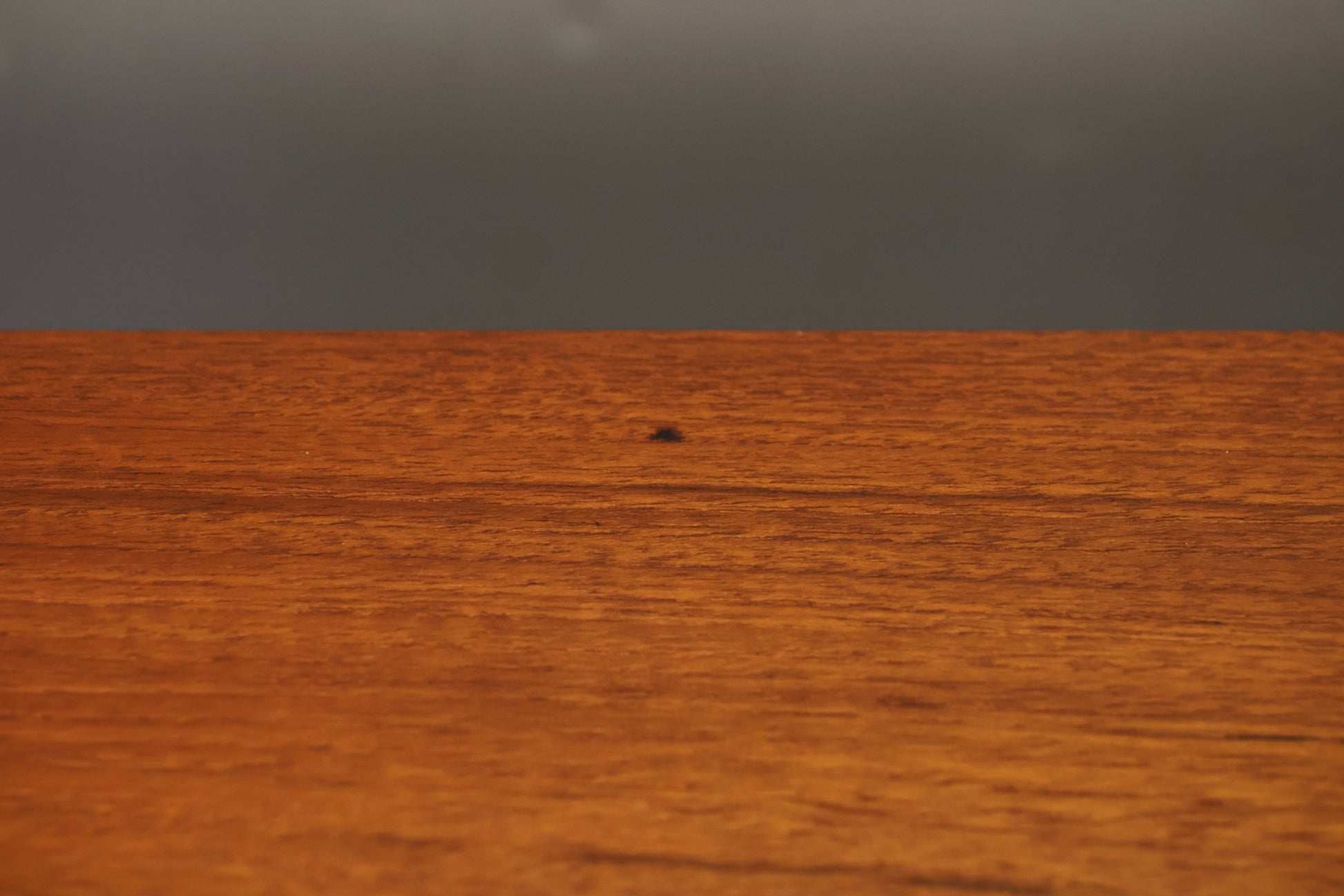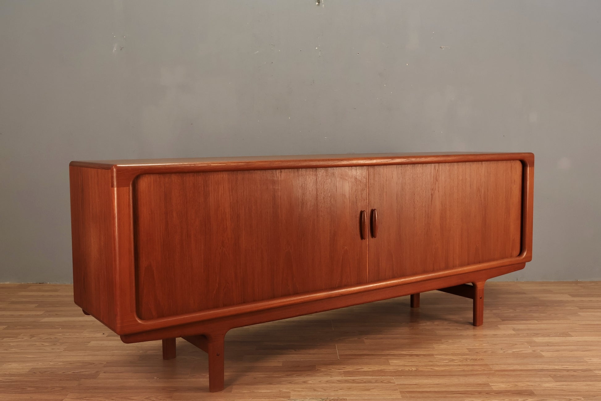 Effortlessly chic long Danish teak credenza. Manufactured by Dyrlund in the 1970s. Two tambour doors open to reveal three center drawers and two symmetrical shelves. Since shelves are adjustable, the piece could fit records in left and right sides. In great second-hand condition with minimal surface wear and markings throughout.