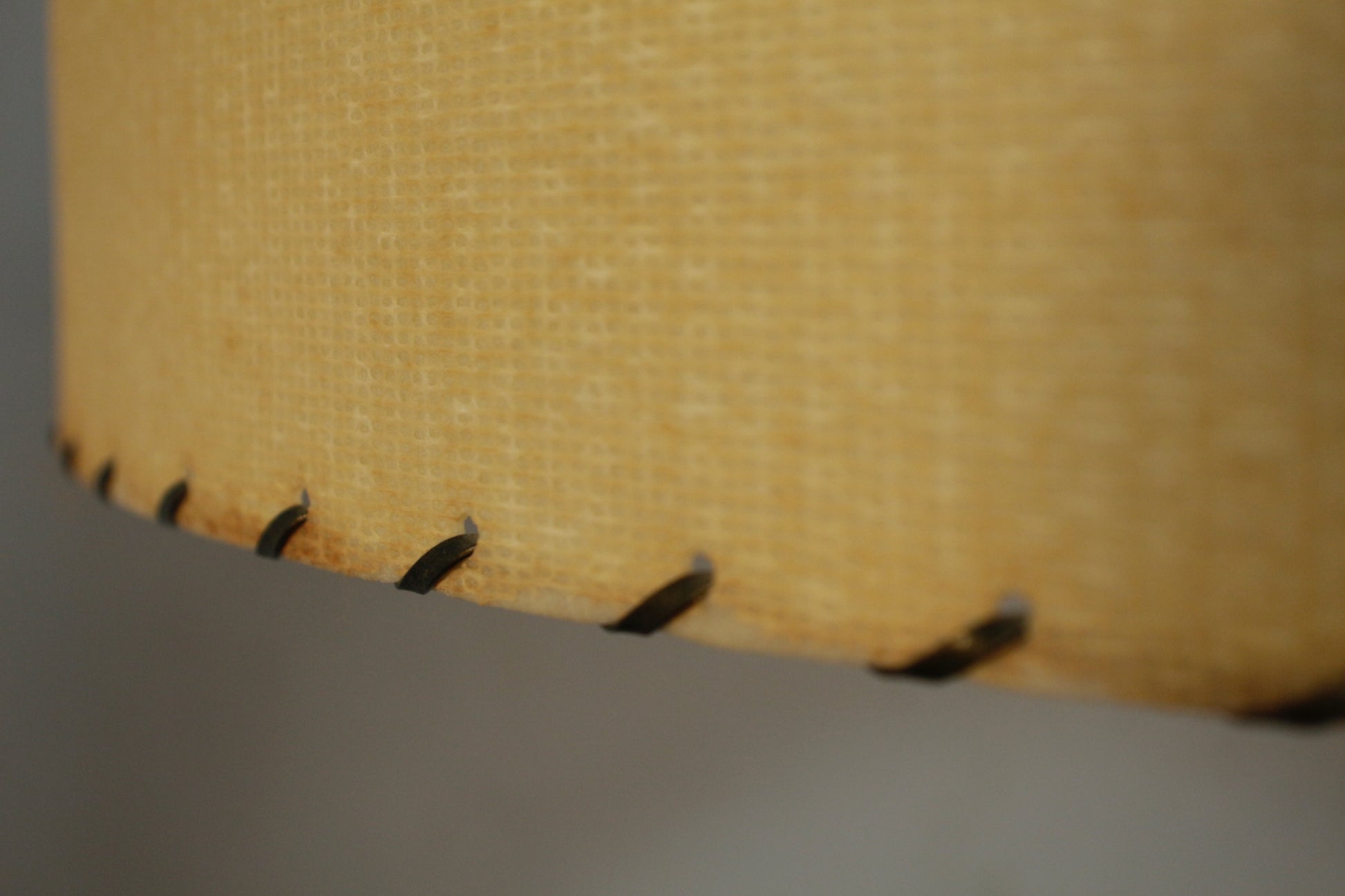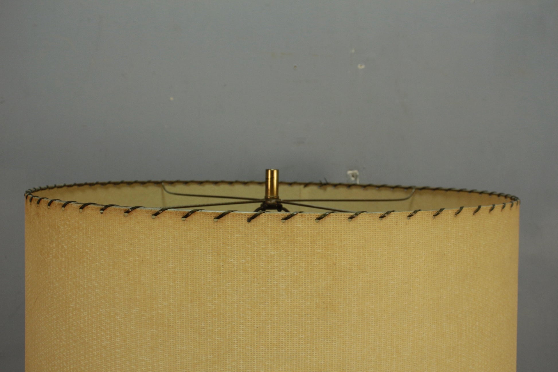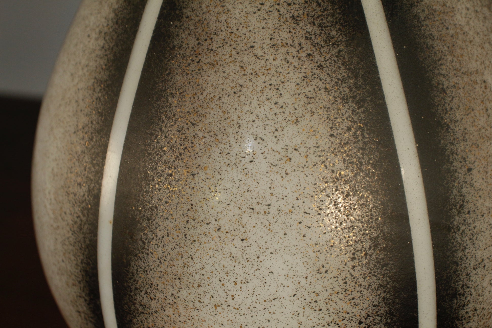Suave mid century glass table lamp with a slim bulbous silhouette and white striped pattern with a smoky, gold-flecked vignette. Topped with a neutral fiberglass drum shade with stitched detailing around the rims. In good condition, light wear. SOLD SEPARATELY.