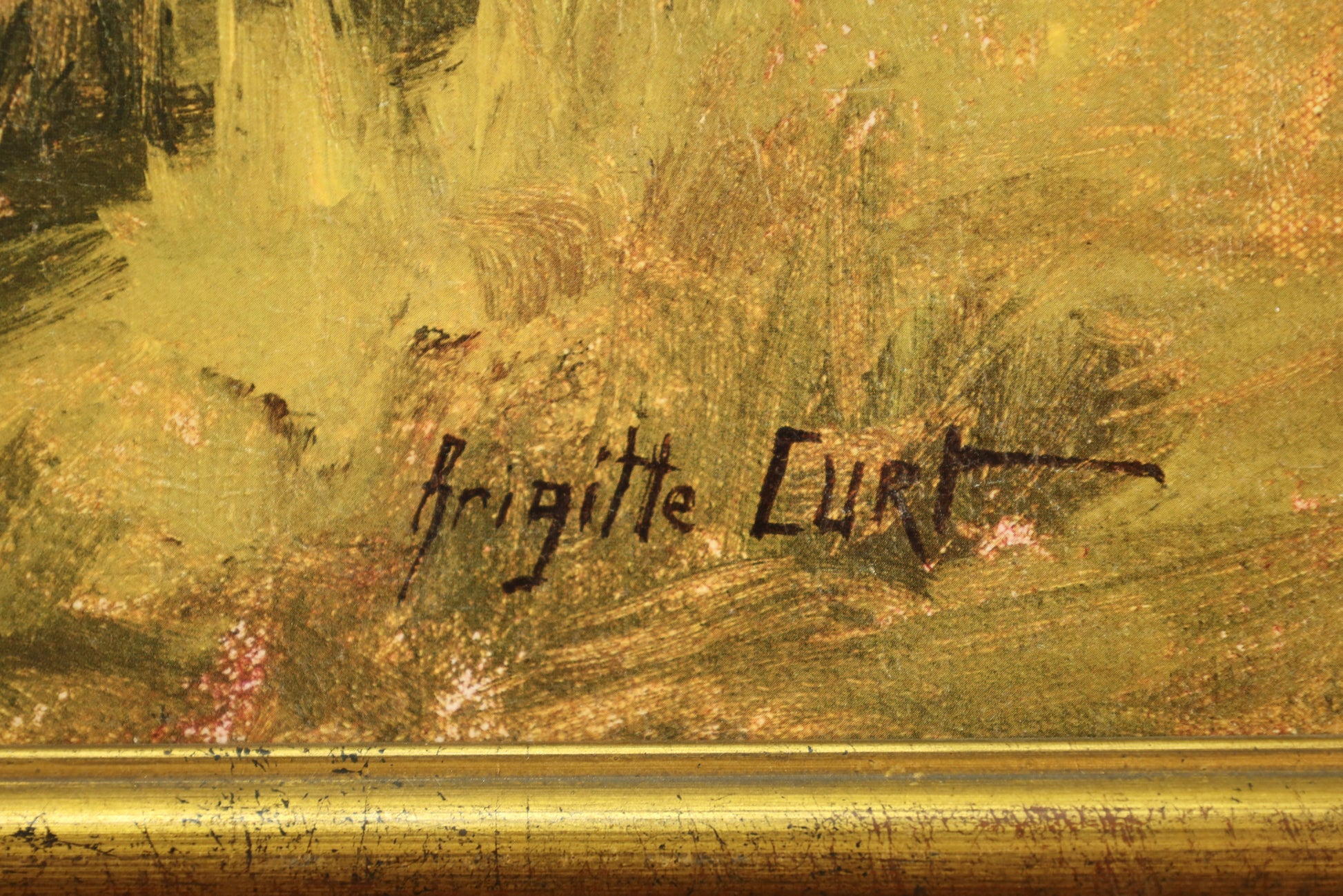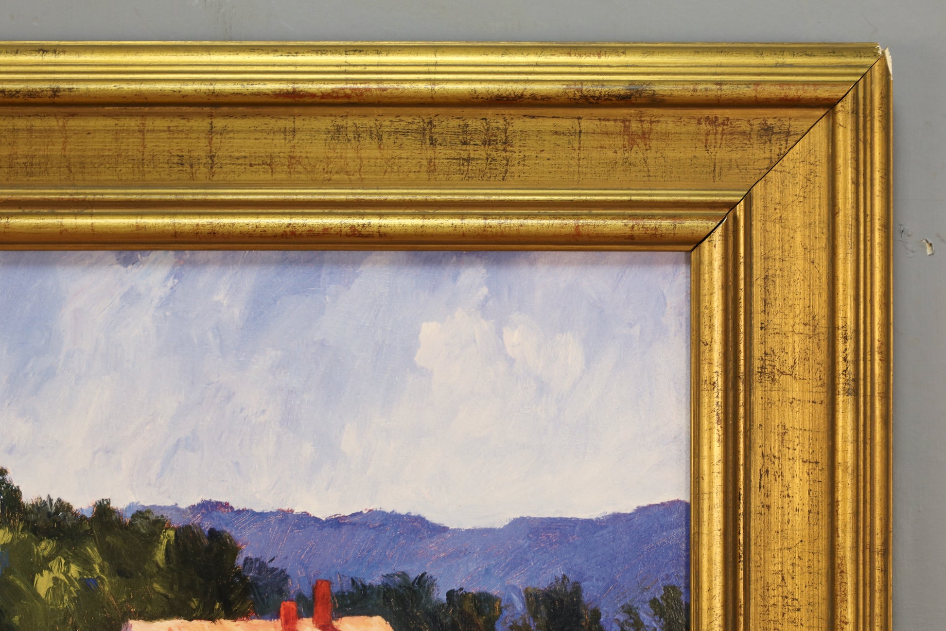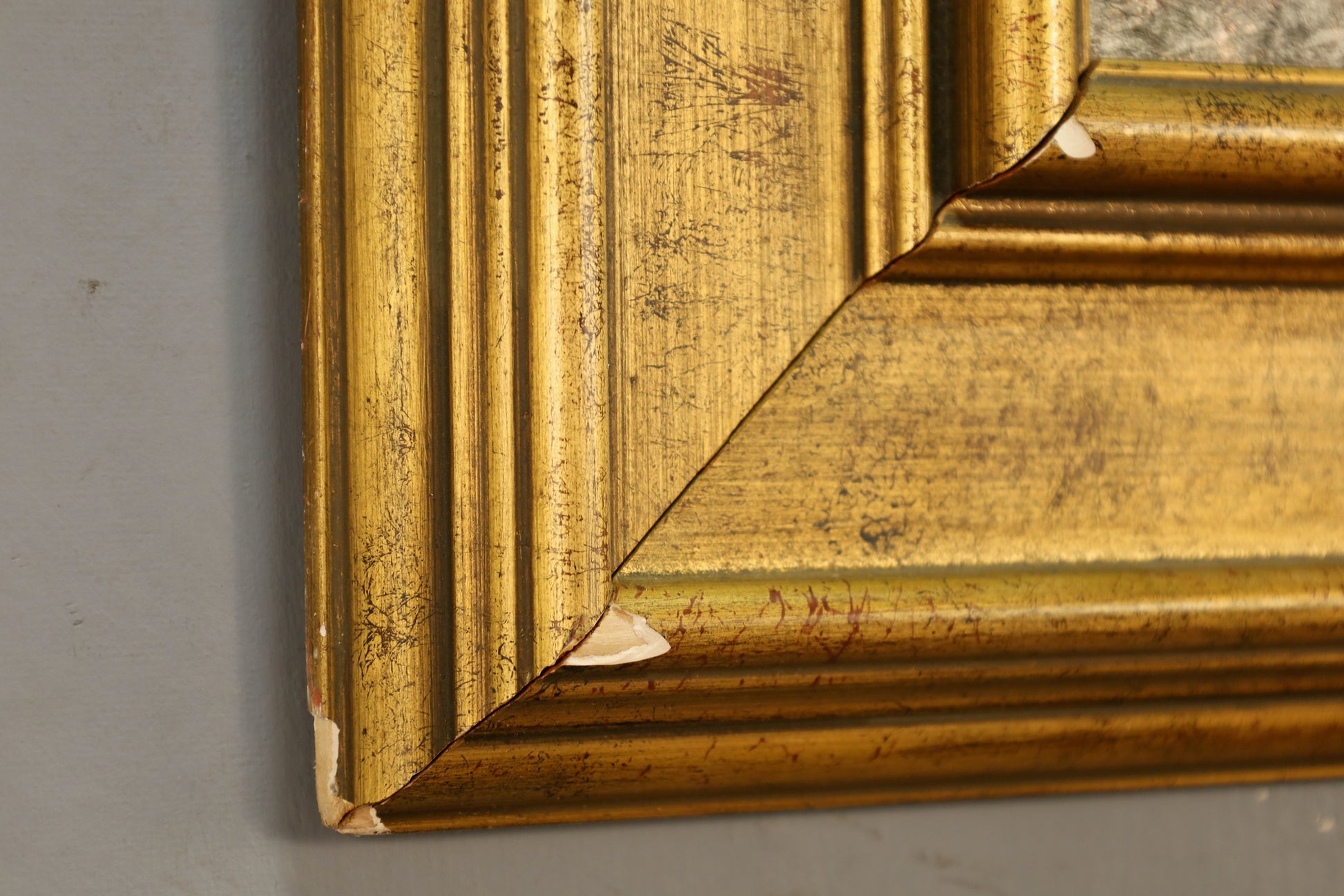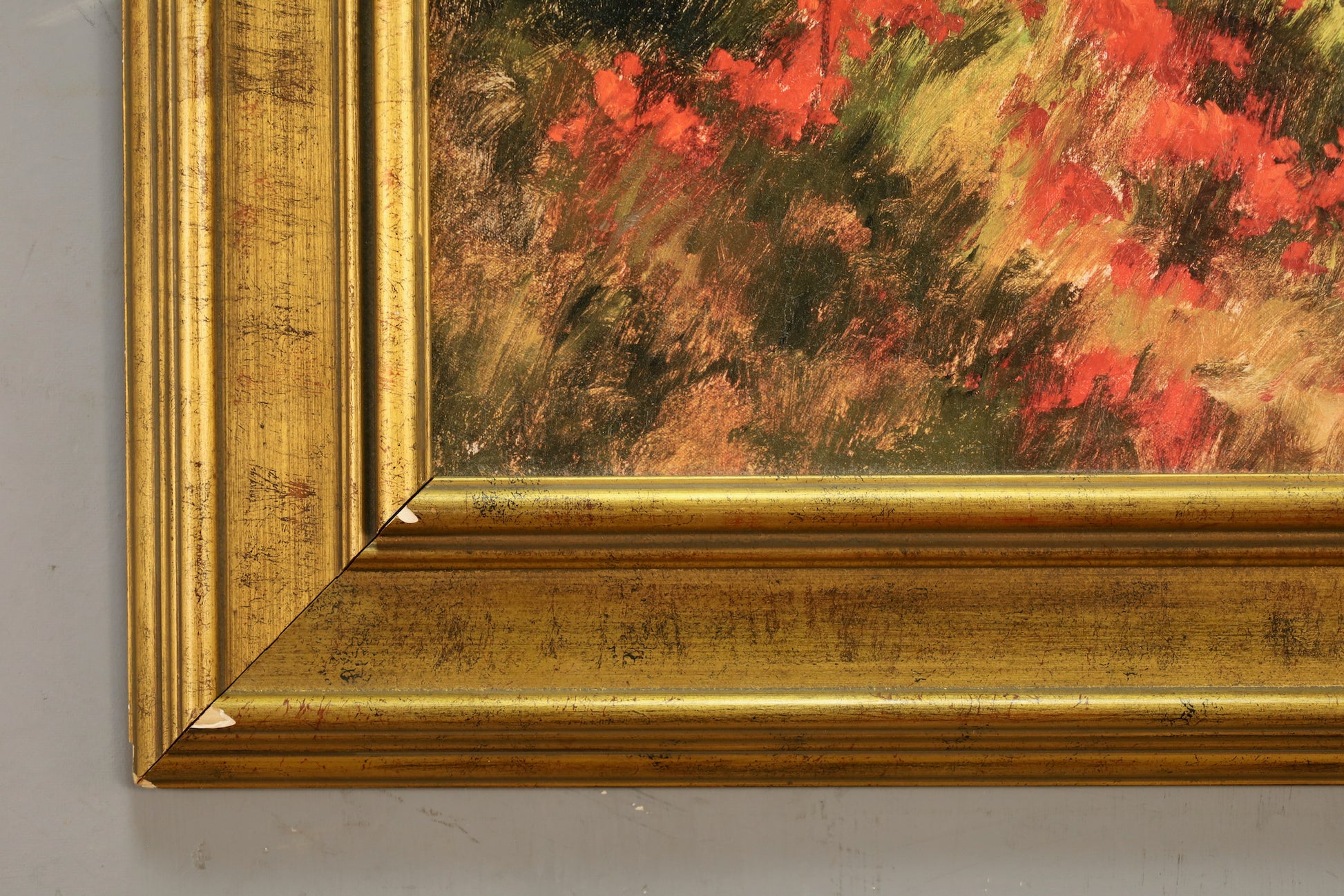 Scenic print of a countryside field with blossoming poppies. Held in a nice gold frame. In good condition, light surface wear and some notable chips to the edge of the frame.