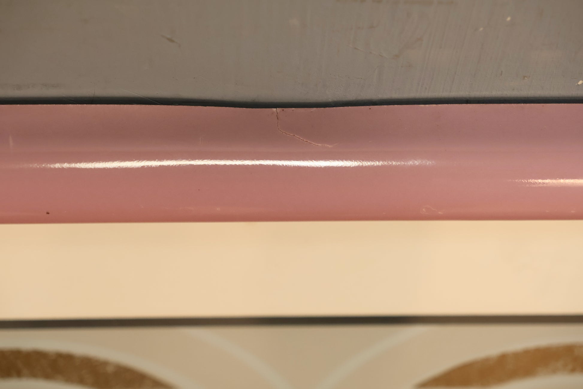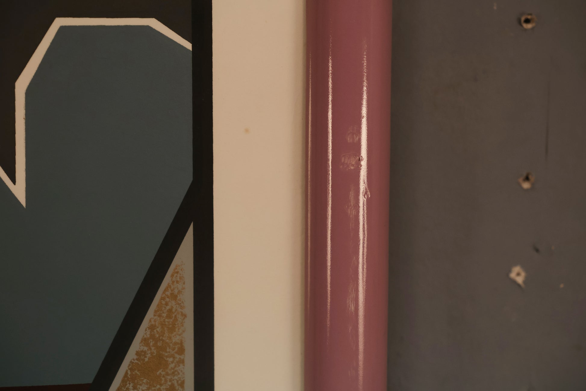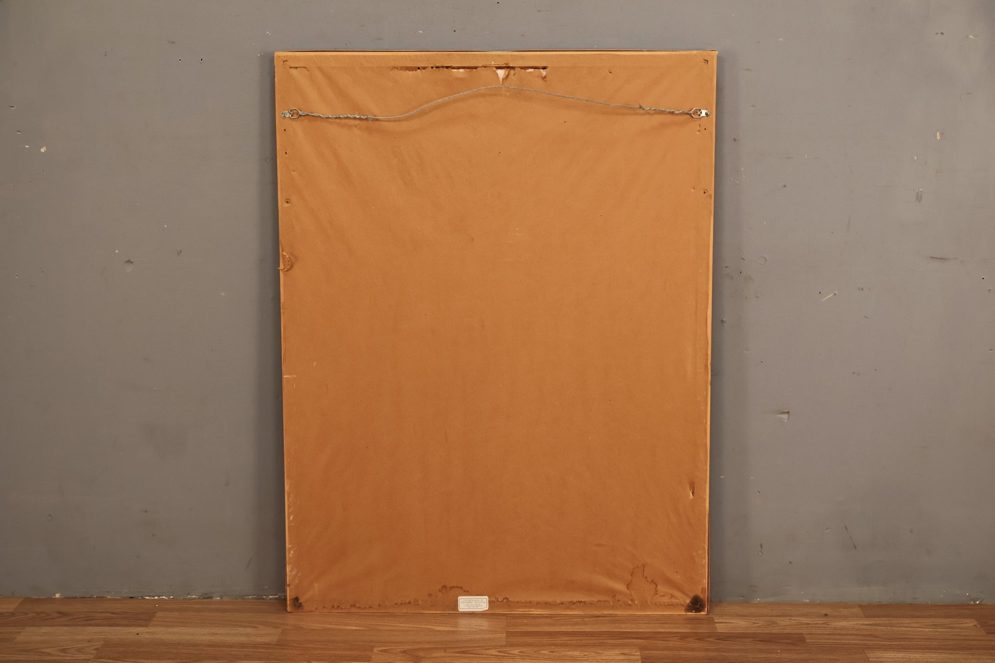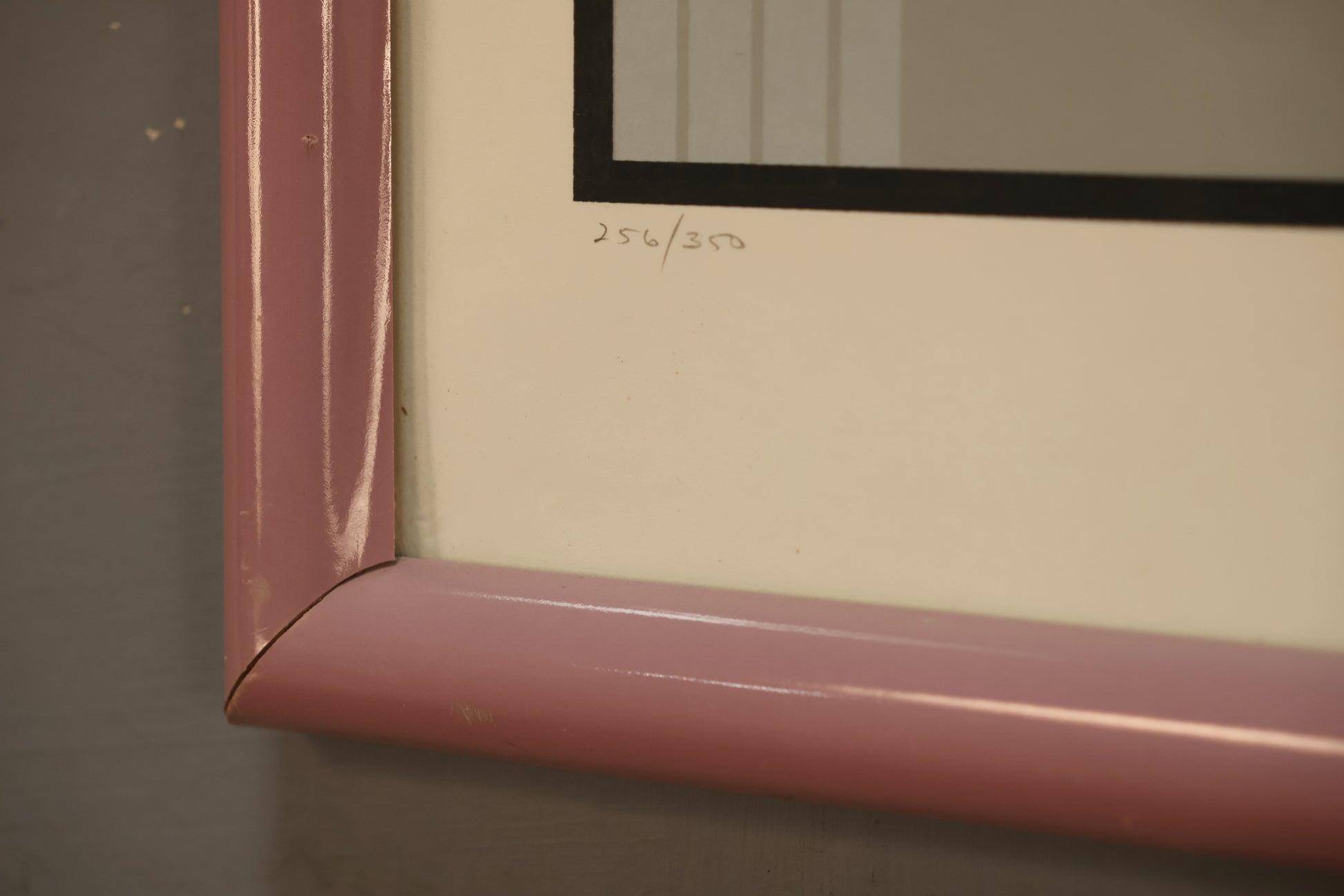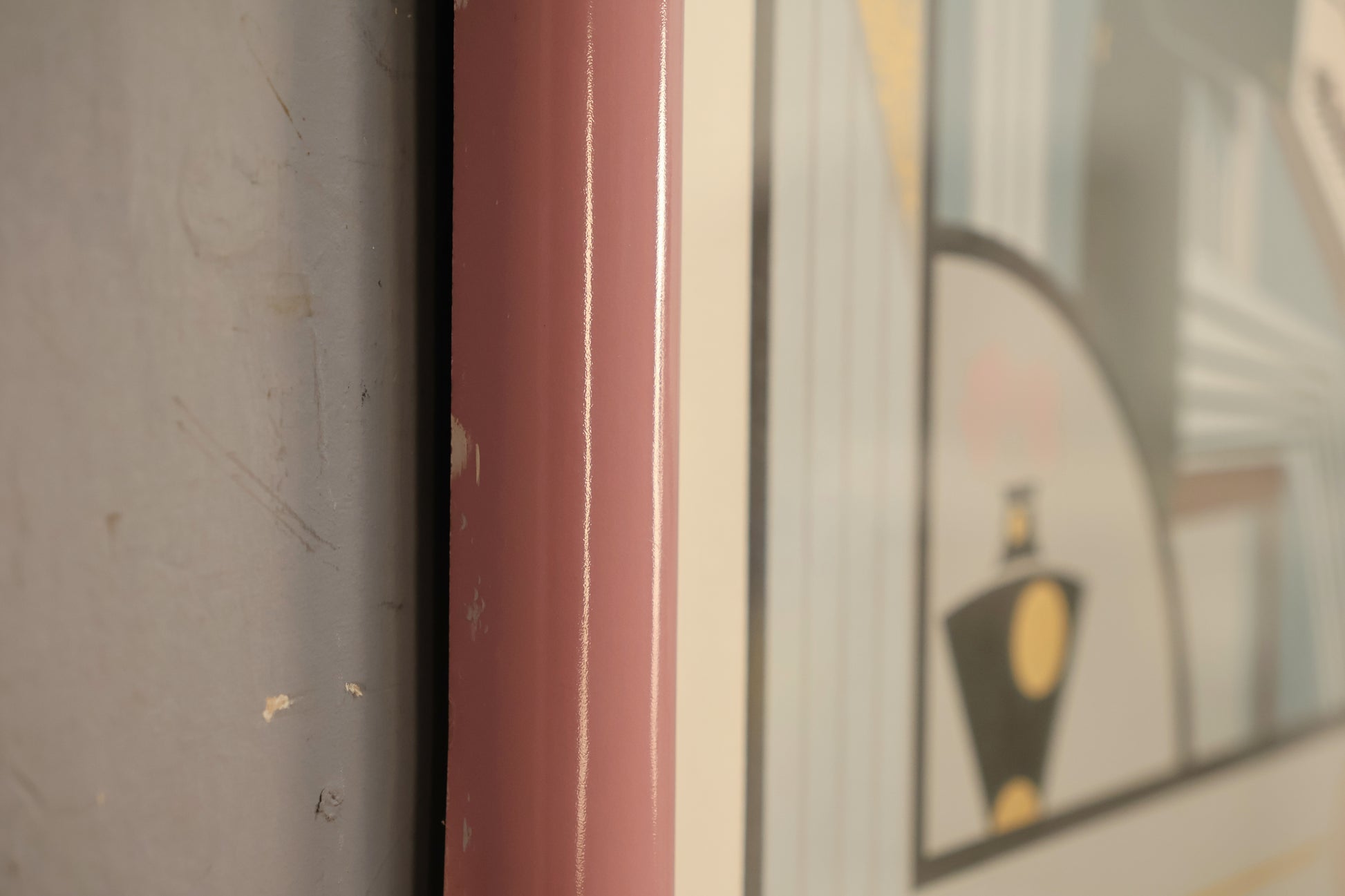 Sultry serigraph of a stylish duo with a skyline in the background. Originally by Nicaraguan artist Luis Peralta del Valle. Held in a mauve lacquered frame that accents the piece well. In good condition, light surface wear mostly to frame.