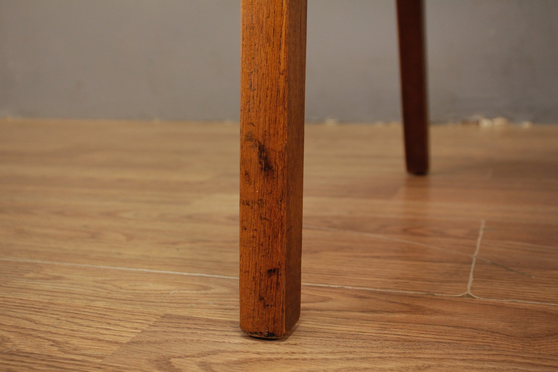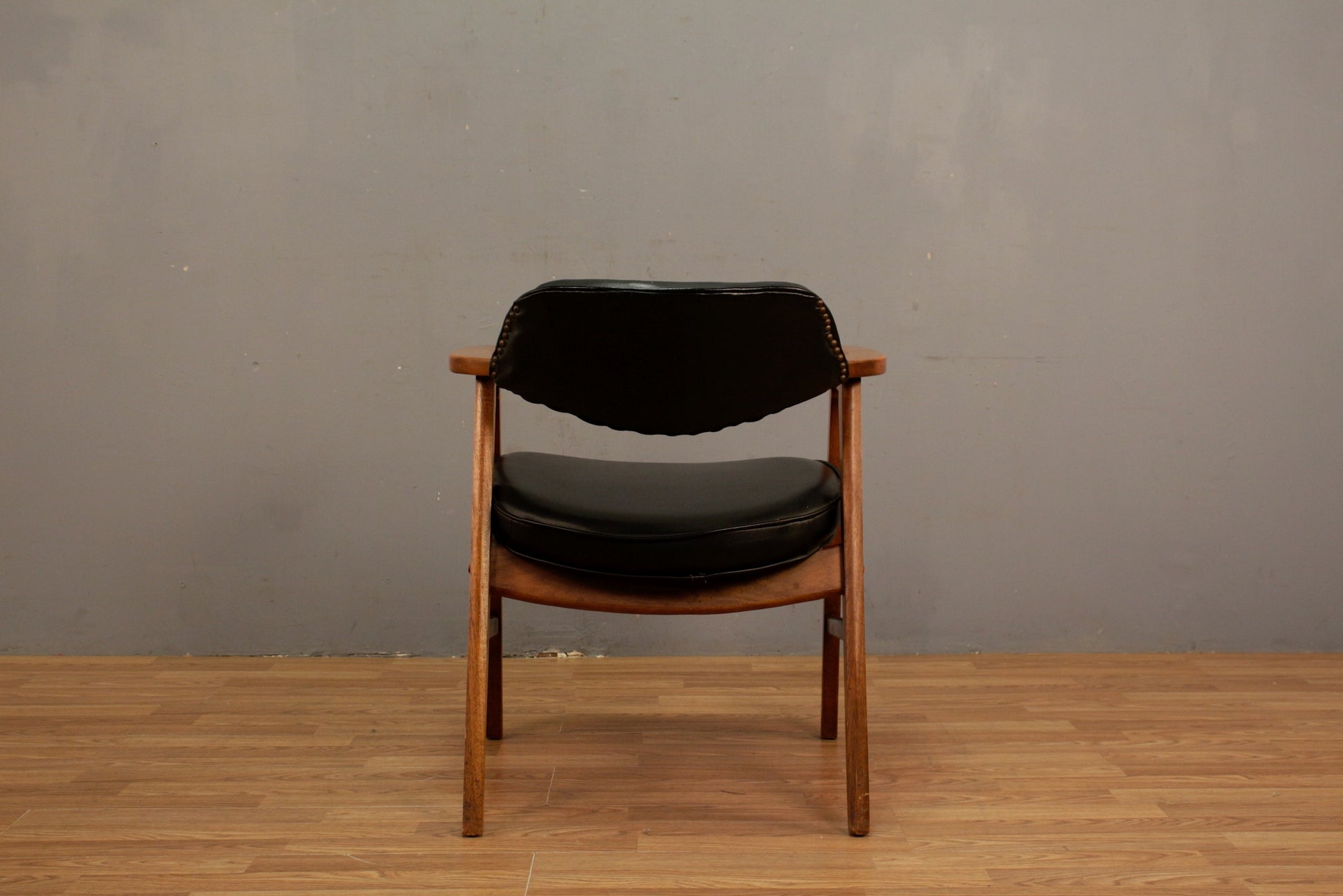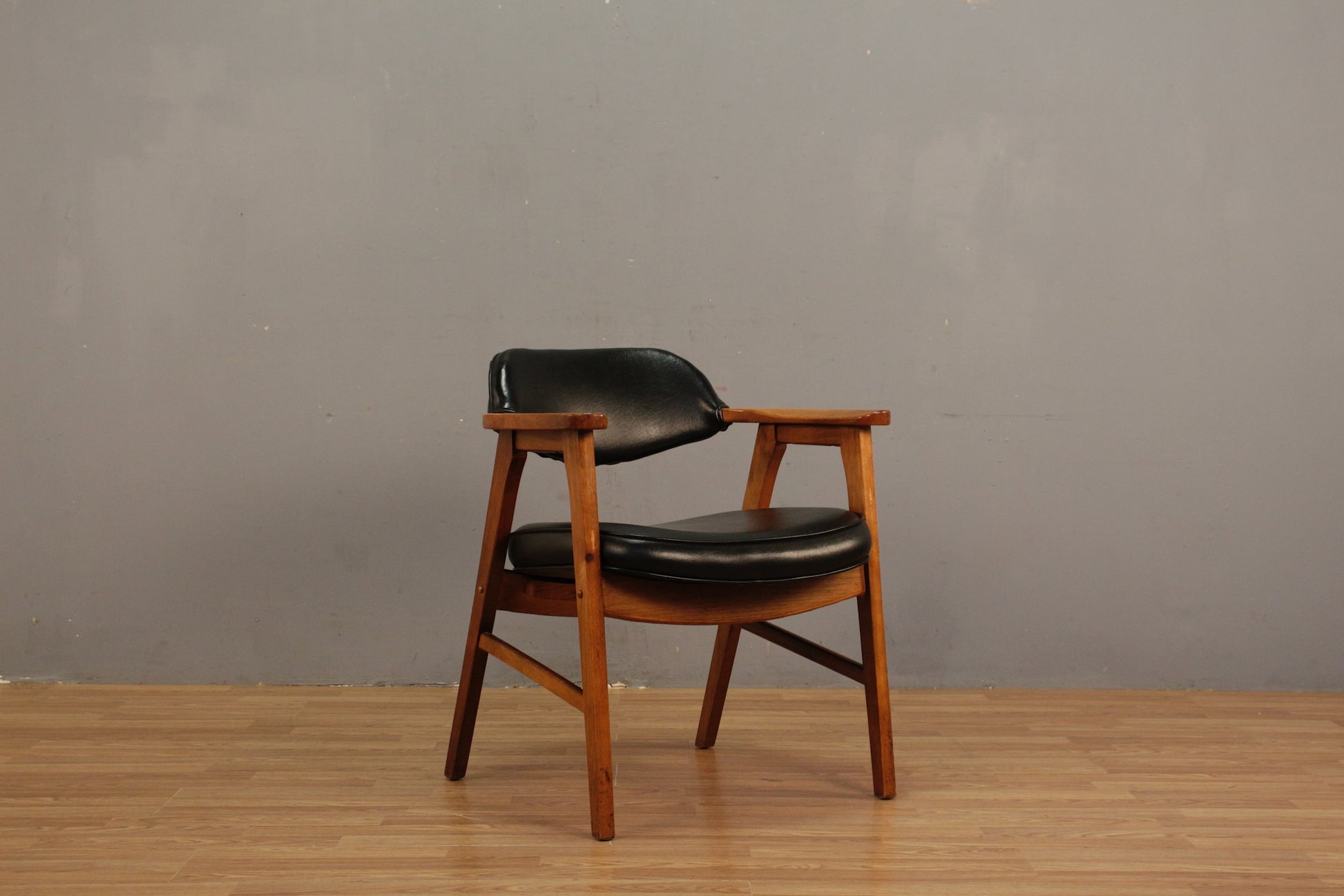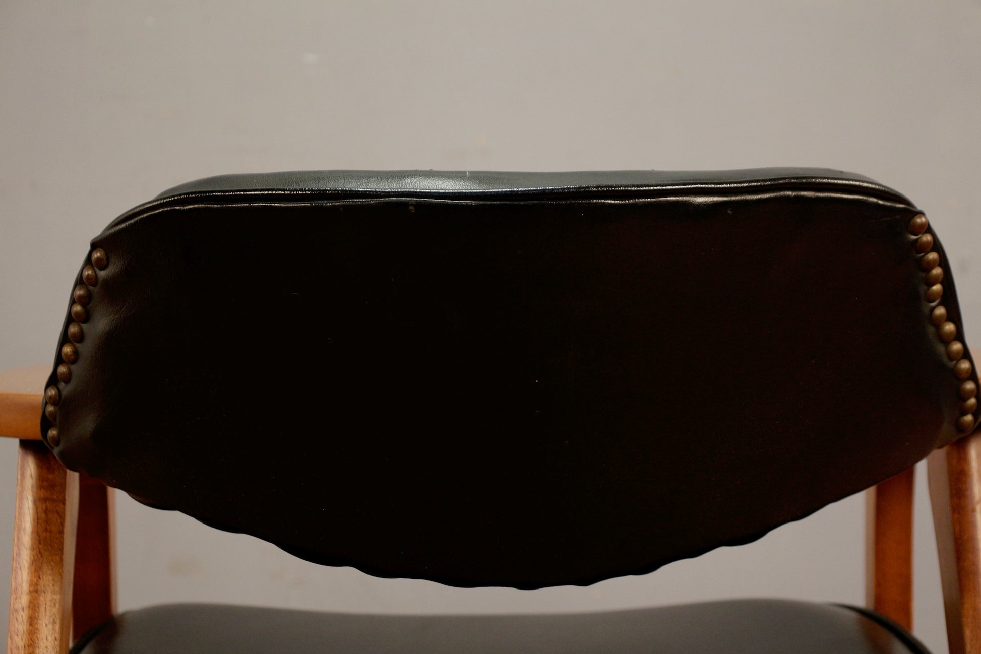 Sophisticated mid century armchair with beautiful mid century details! Warm wooden frame has classic shape with softly curved armrests finished with sleek black vinyl upholstered seat and backrests. Would look great in an office or living space. Seat height is 18 inches and armrest height is 25 inches. In good condition, some general surface wear and scuffing to frame. Upholstery has some light wear that varies between chairs. Vinyl on underside of backrest is a bit rippled. SOLD SEPARATELY.