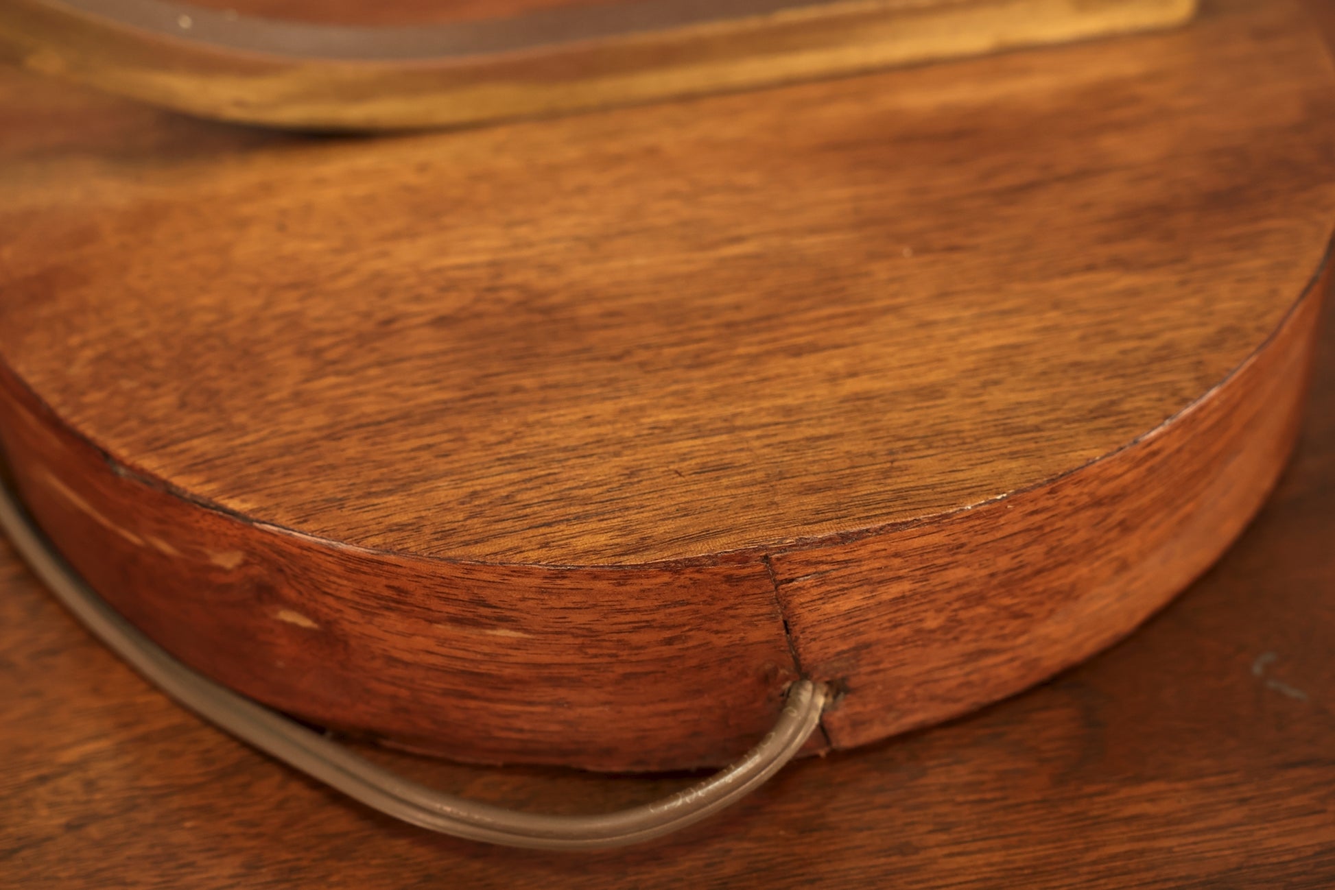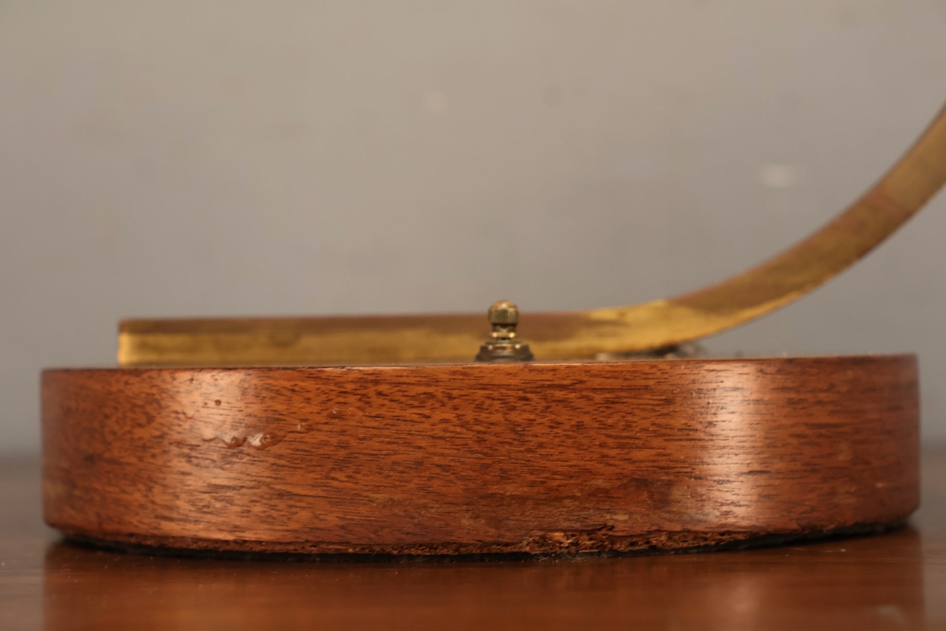 Gorgeous 1960s table lamp that is sure to impress your friends! Walnut base holds a curved brass neck that holds two swirled glass globes. Stunning! Has three light settings. In good condition, light surface wear throughout with some tarnish to the metal.