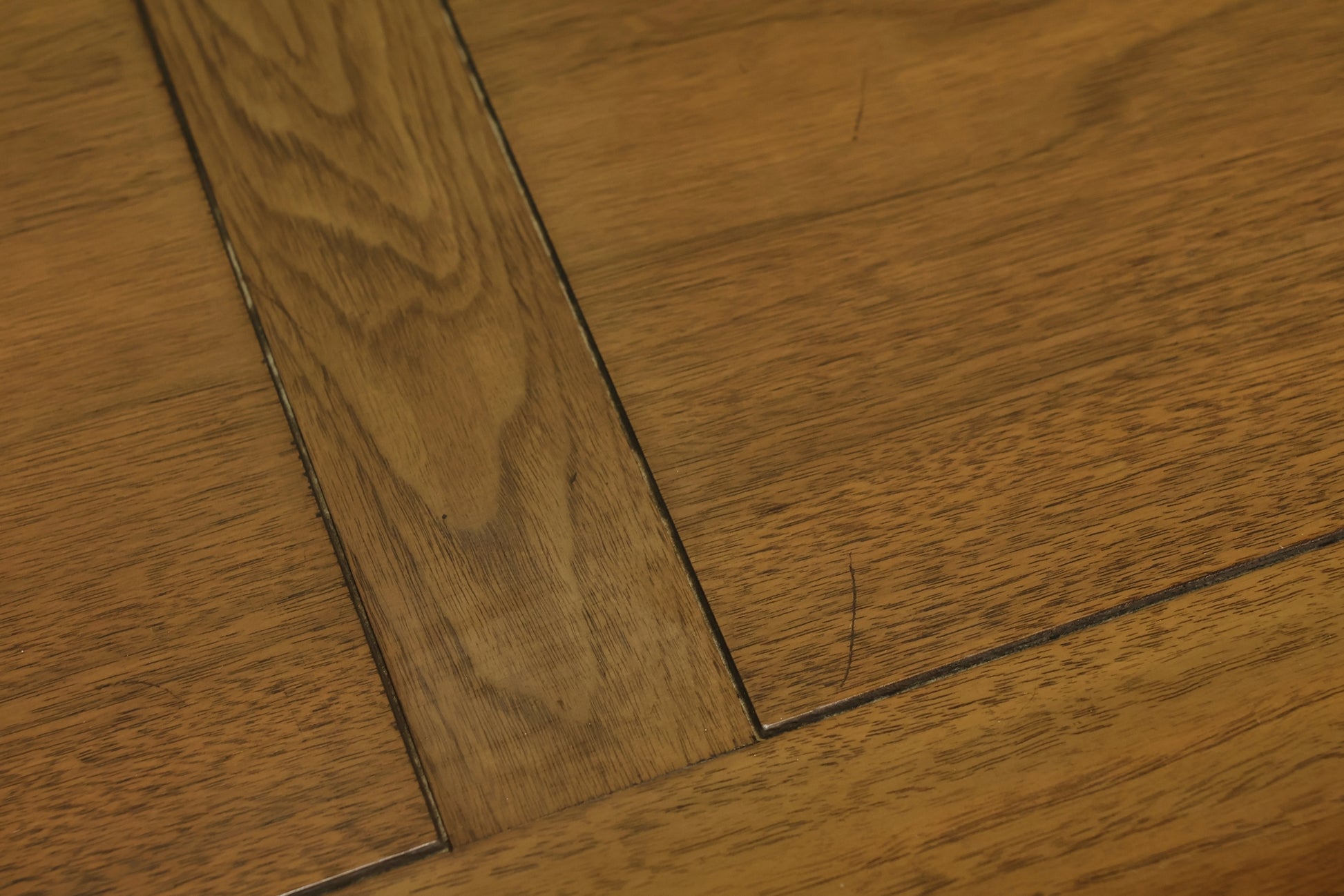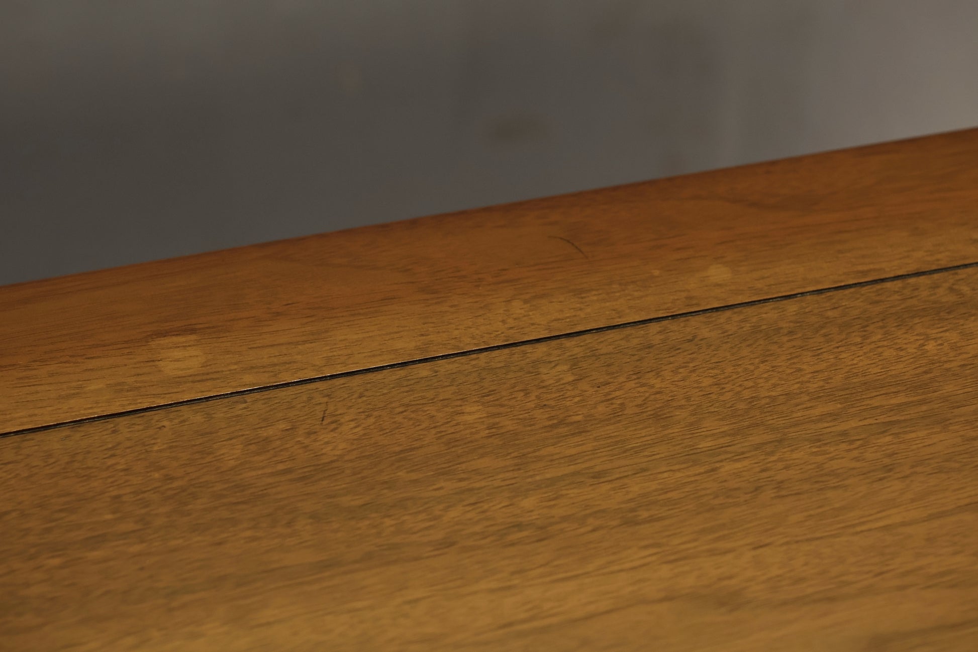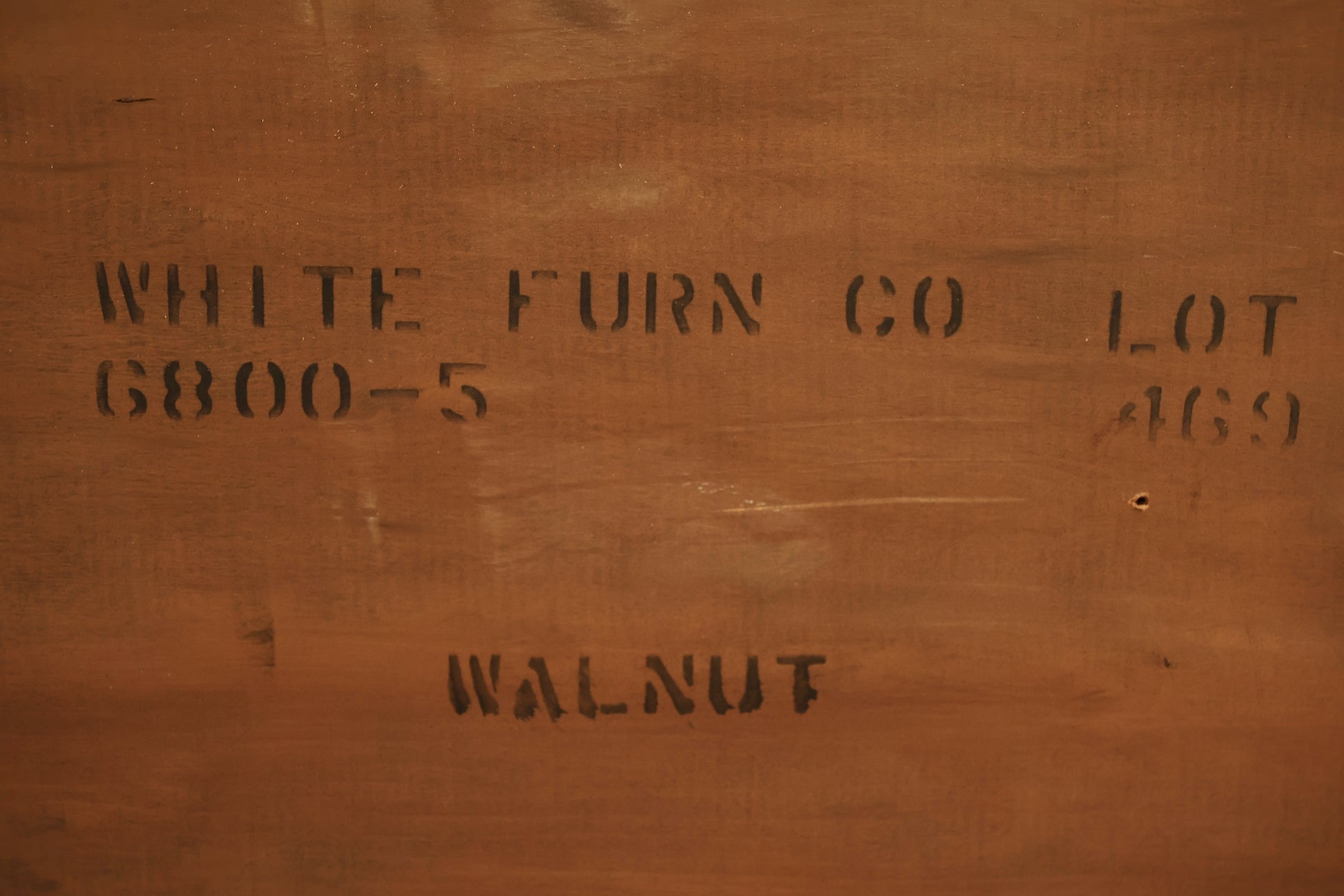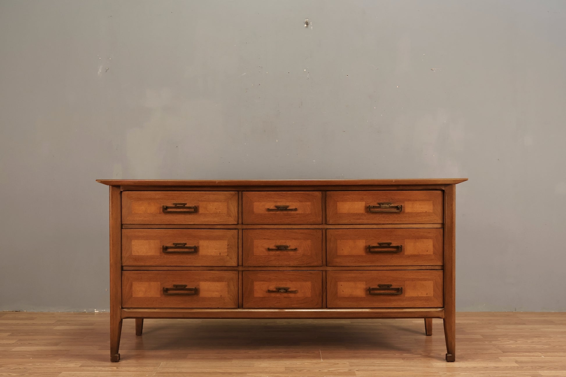 Handsome walnut dresser. Manufactured by White Furniture. Two-toned walnut inlay. Features nine drawers with brass pulls. Some general surface wear and edgewear throughout.