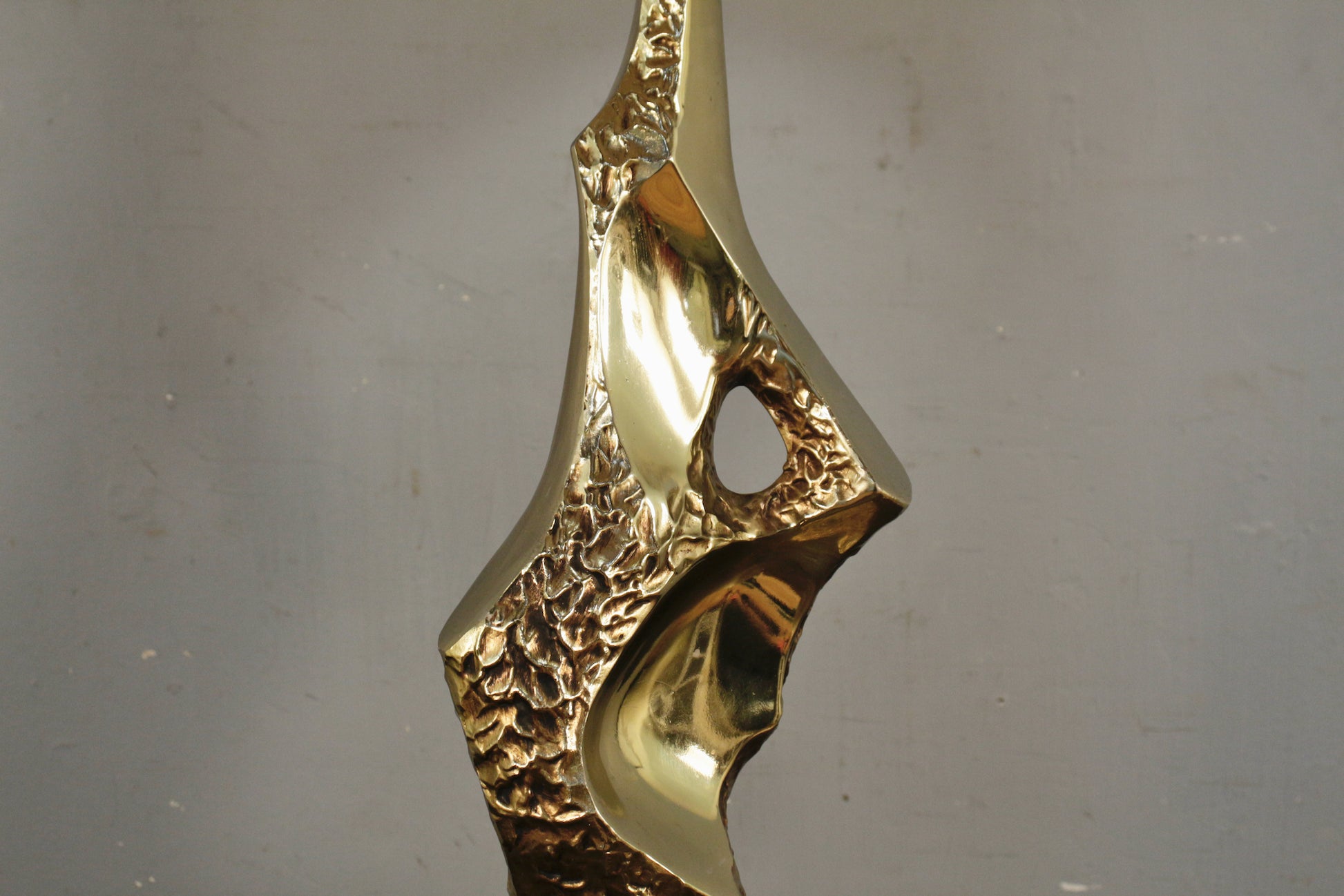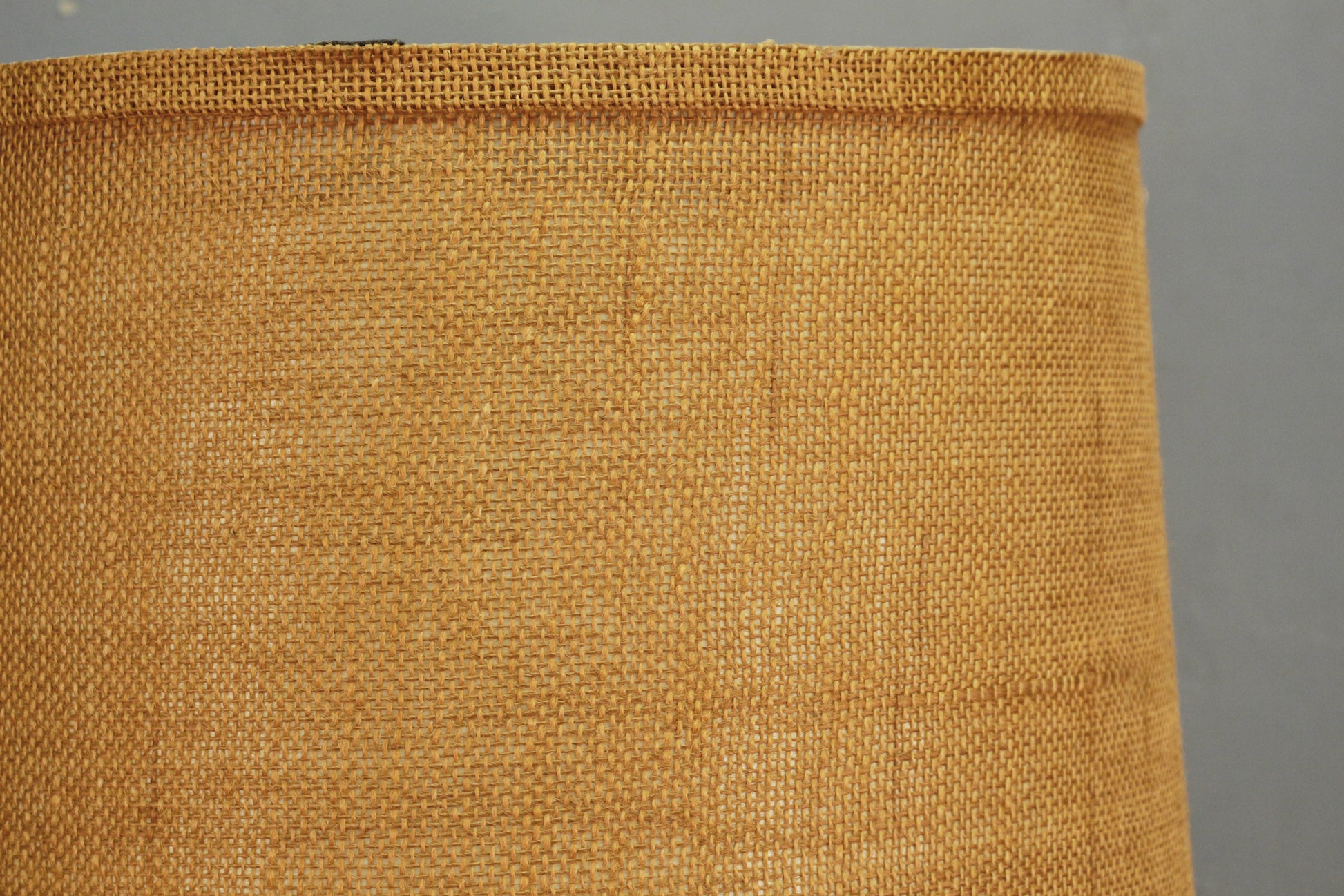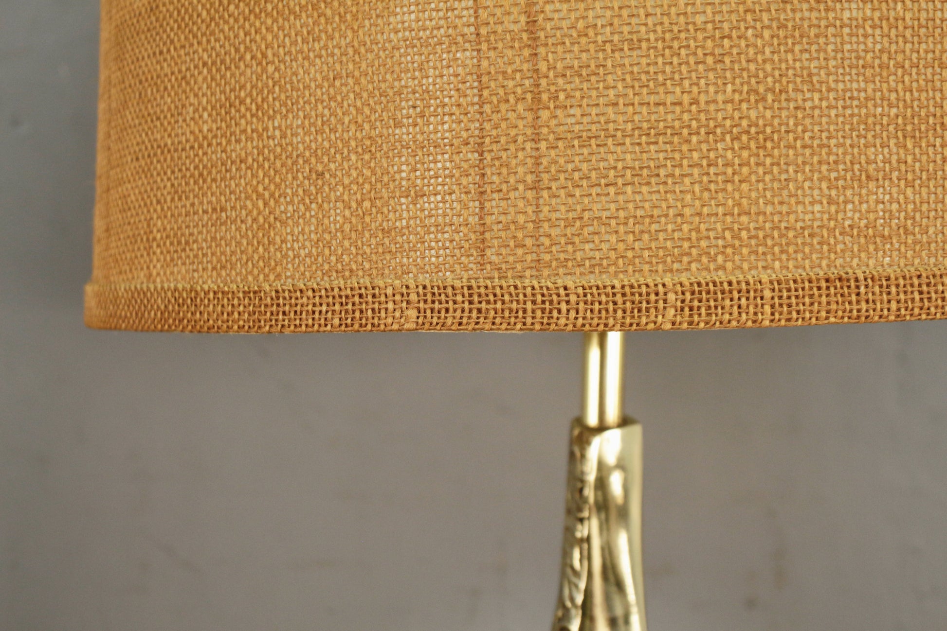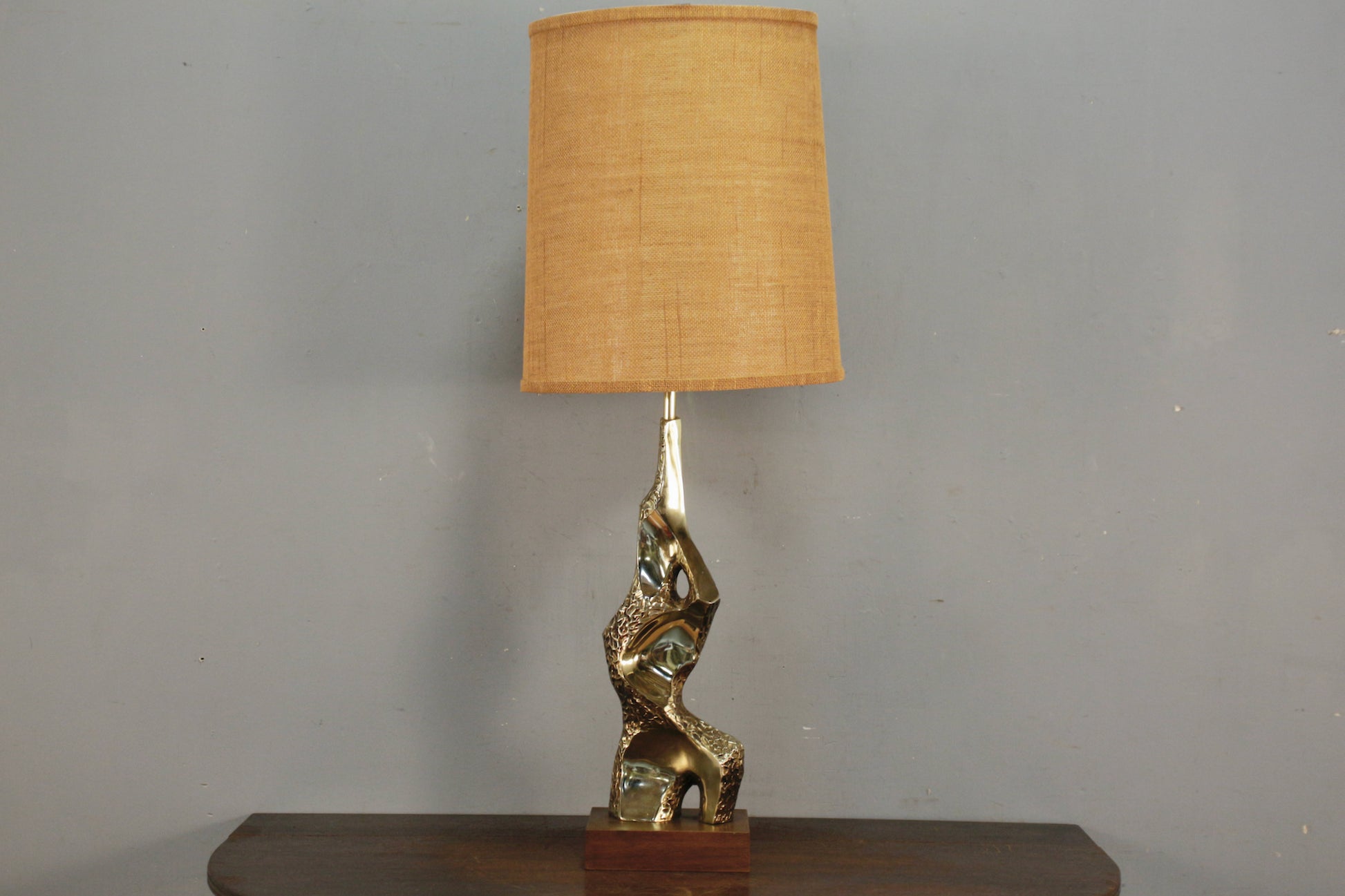 Sculptural polished brass table lamp with hammered details designed by Richard Barr for Laurel Lamp Co. in the 1970s. Finished with a walnut base and woven burlap lampshade. An eye-catching piece that is sure to complete any surface! In good condition, light wear