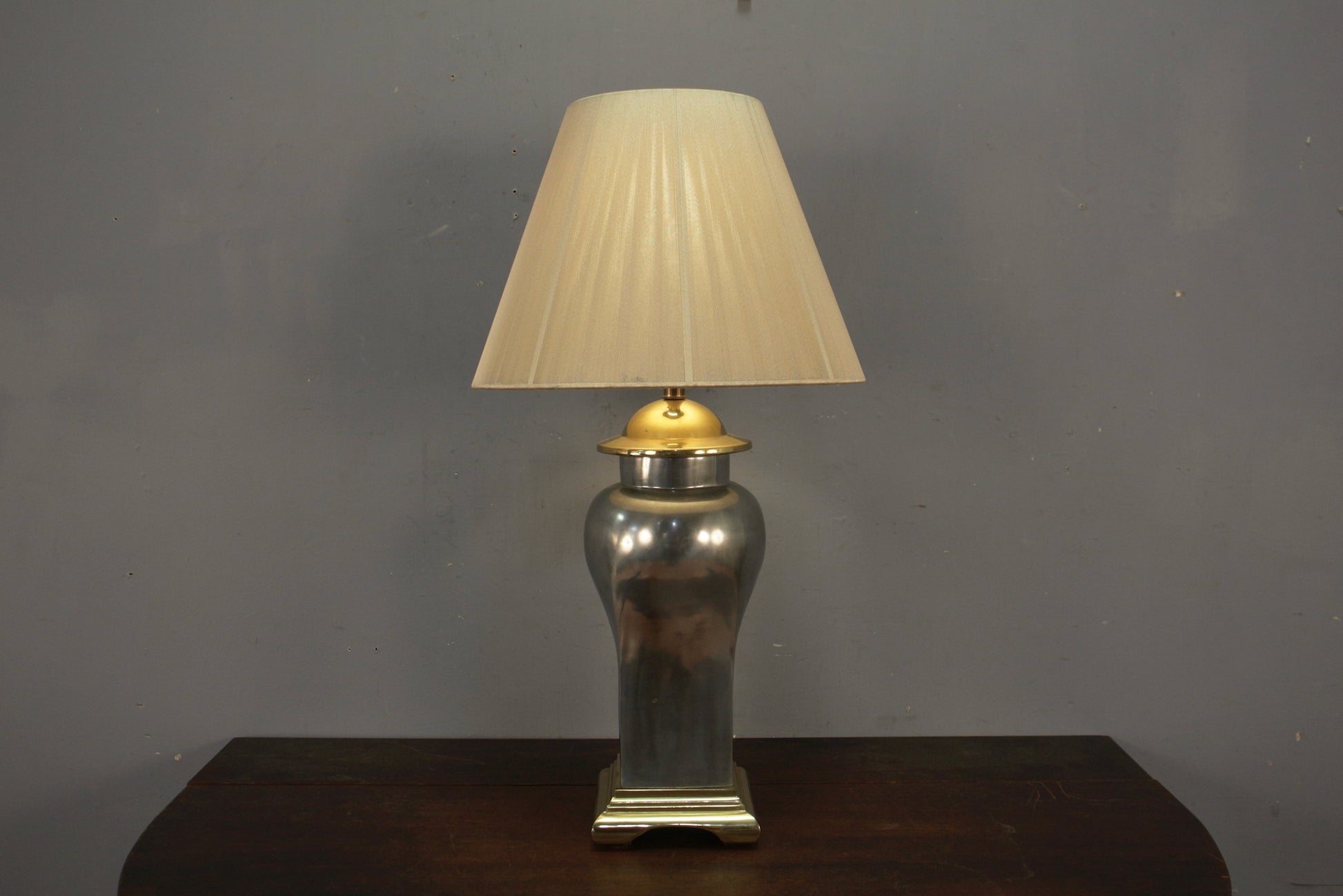 Elegant silver and gold table lamp. Some minor scuffs and light scratches towards the base. SOLD SEPARATELY.