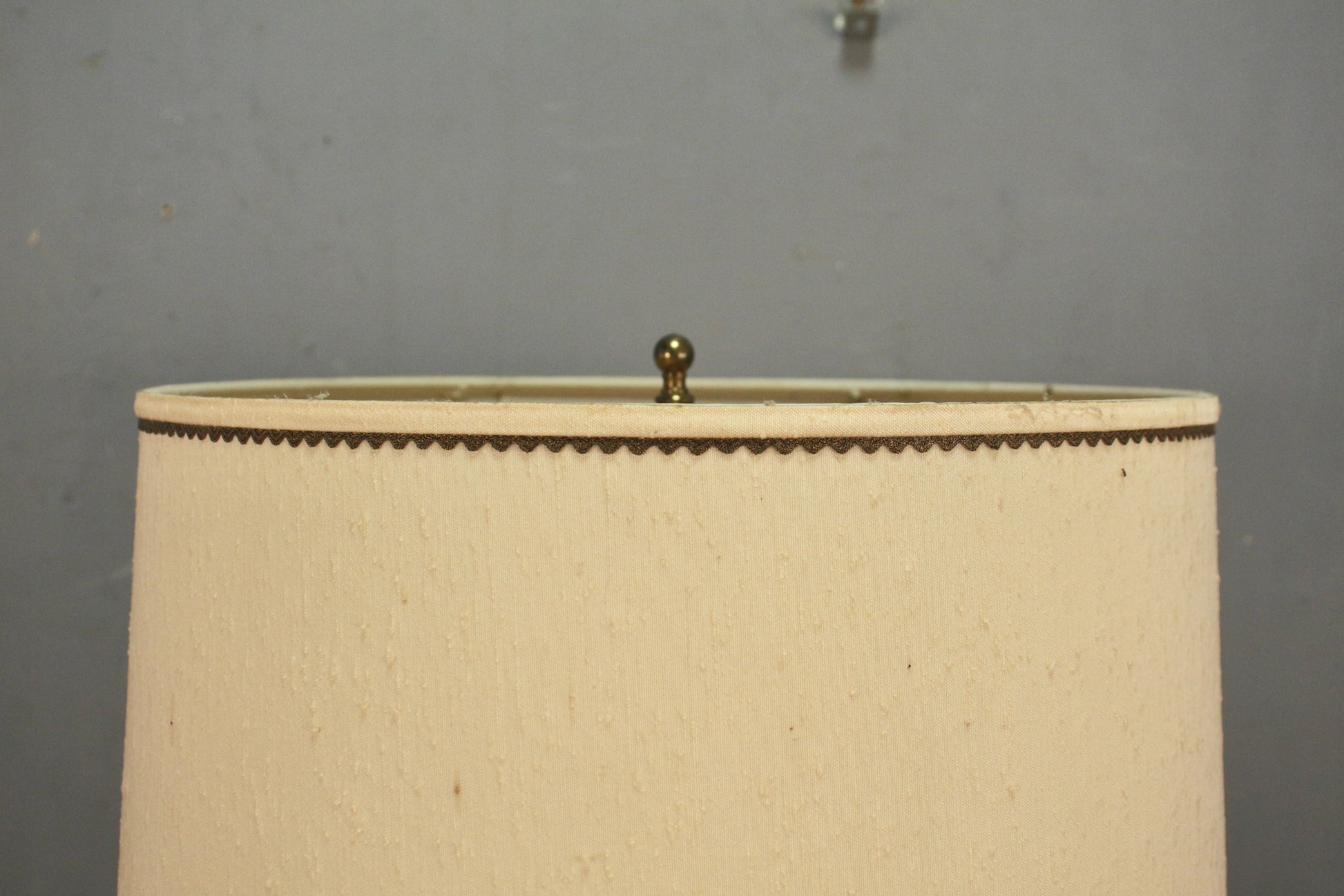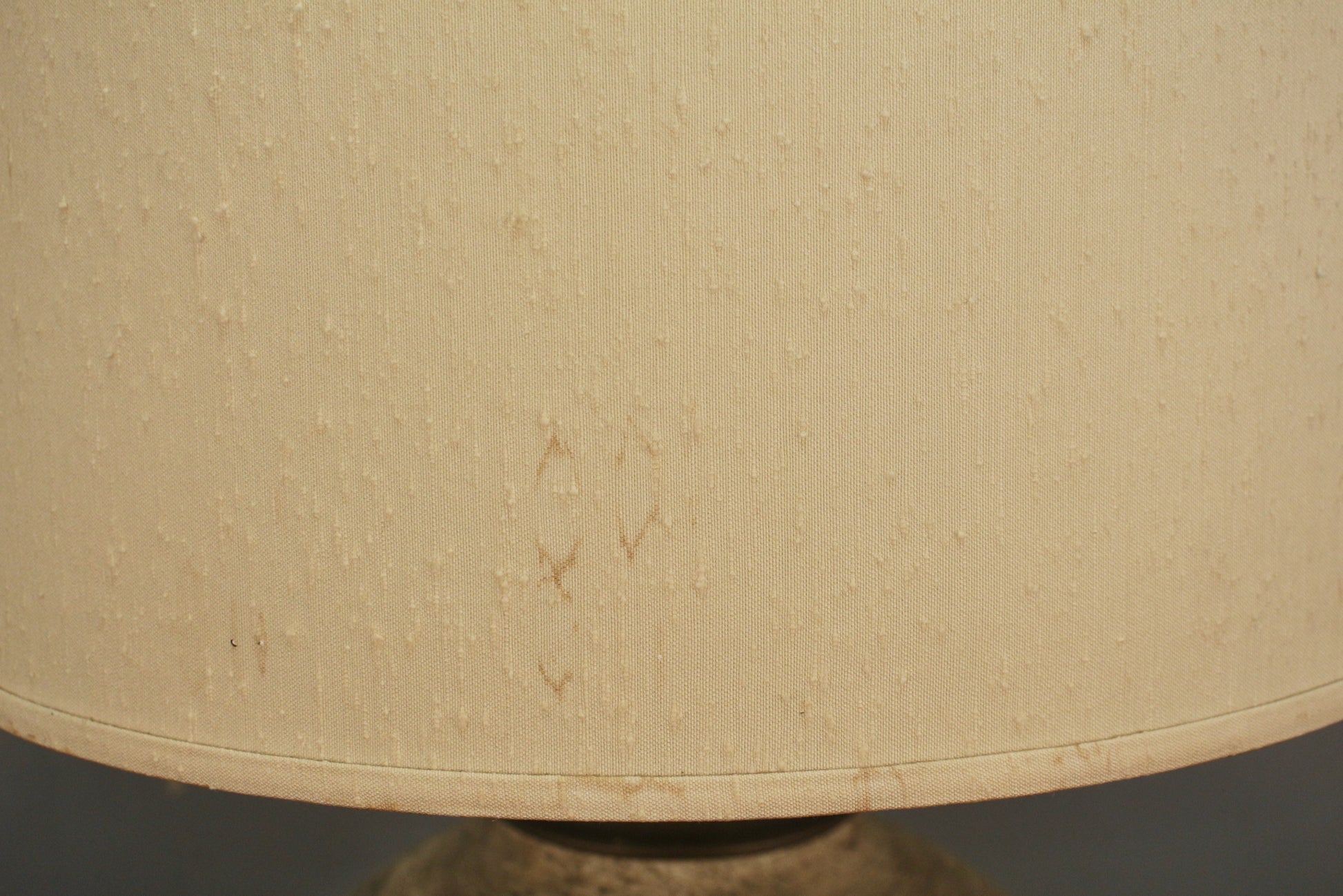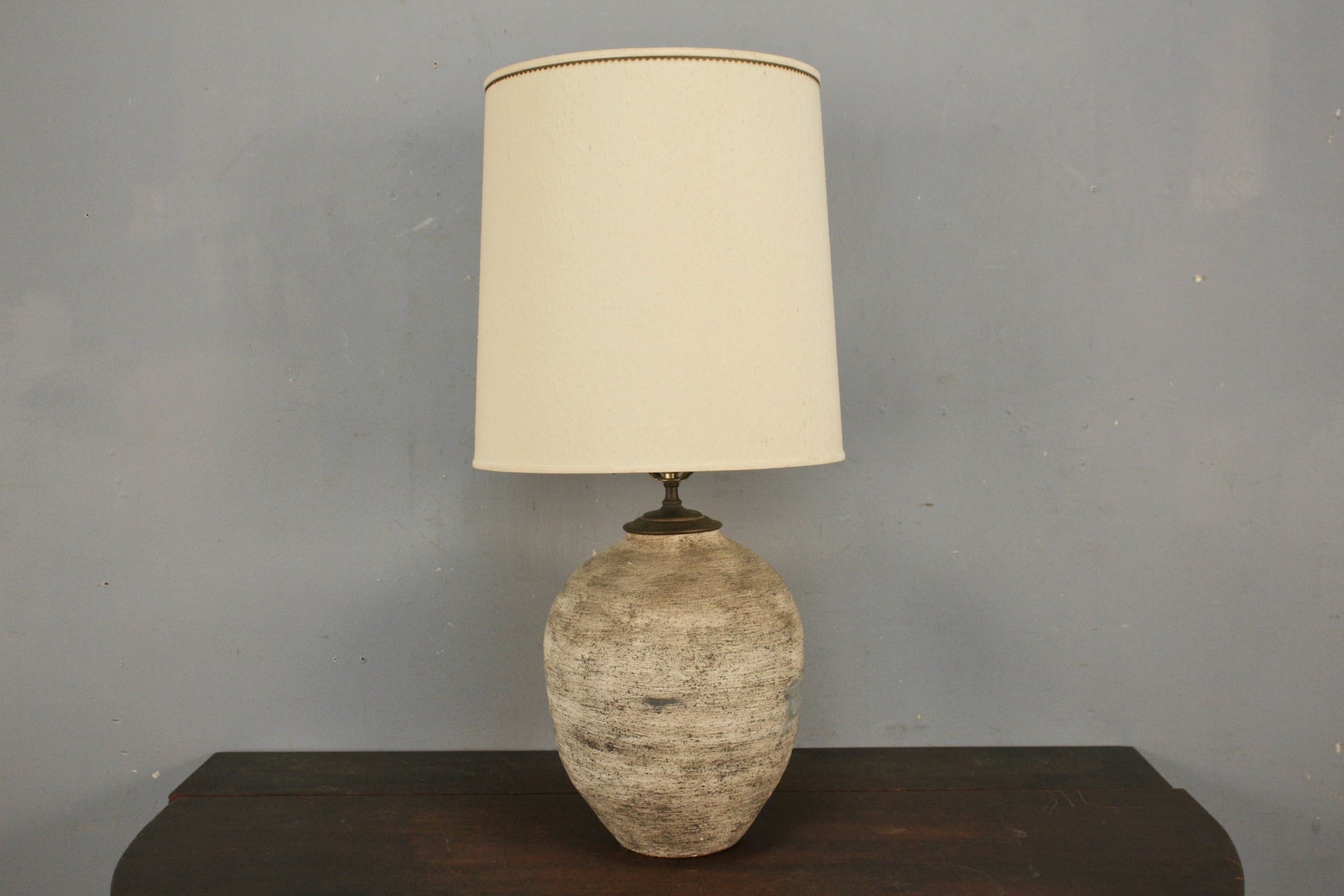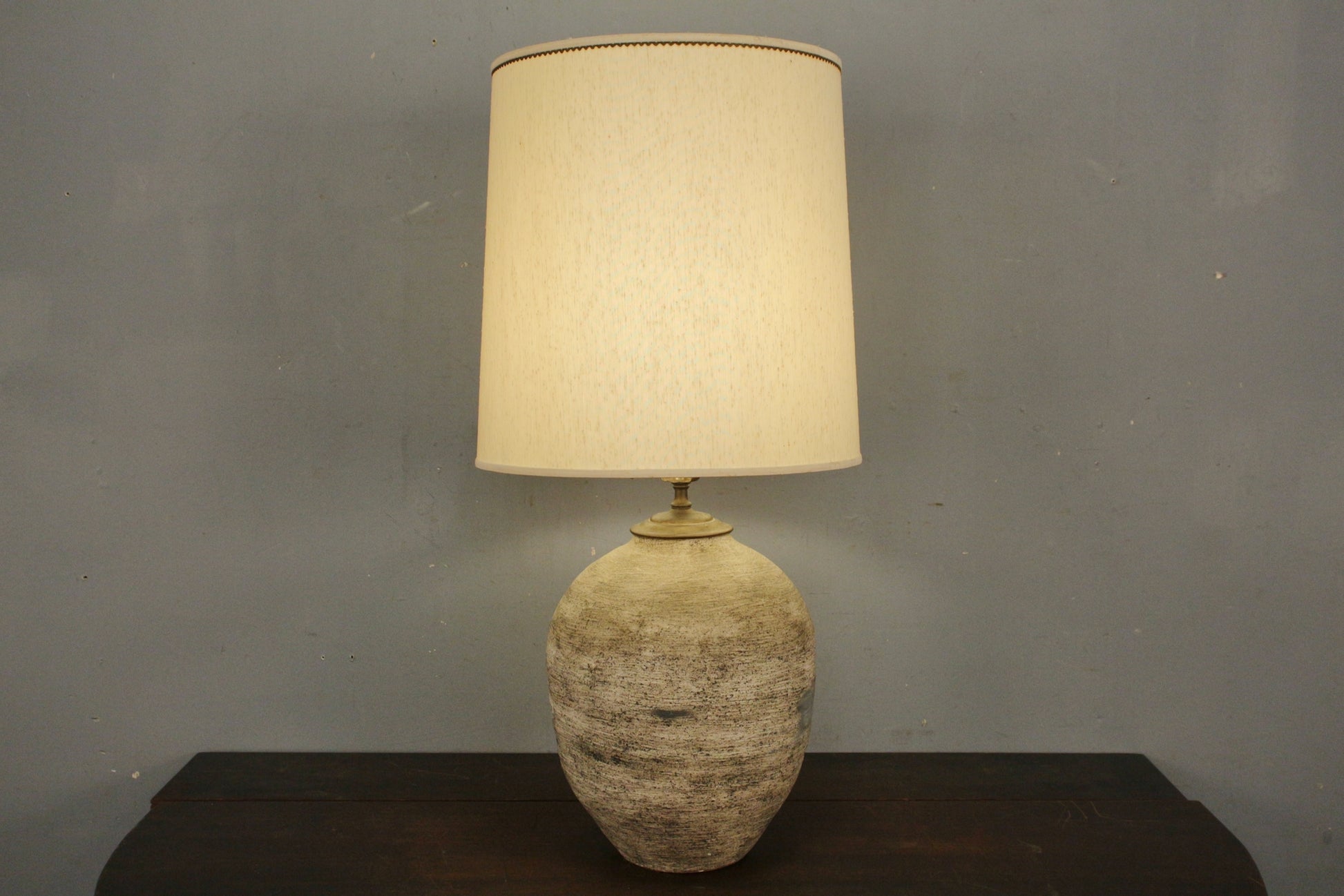 Textured stoneware table lamp. Simple cotton lampshade. Some notable spots where the stoneware base was previously repaired.