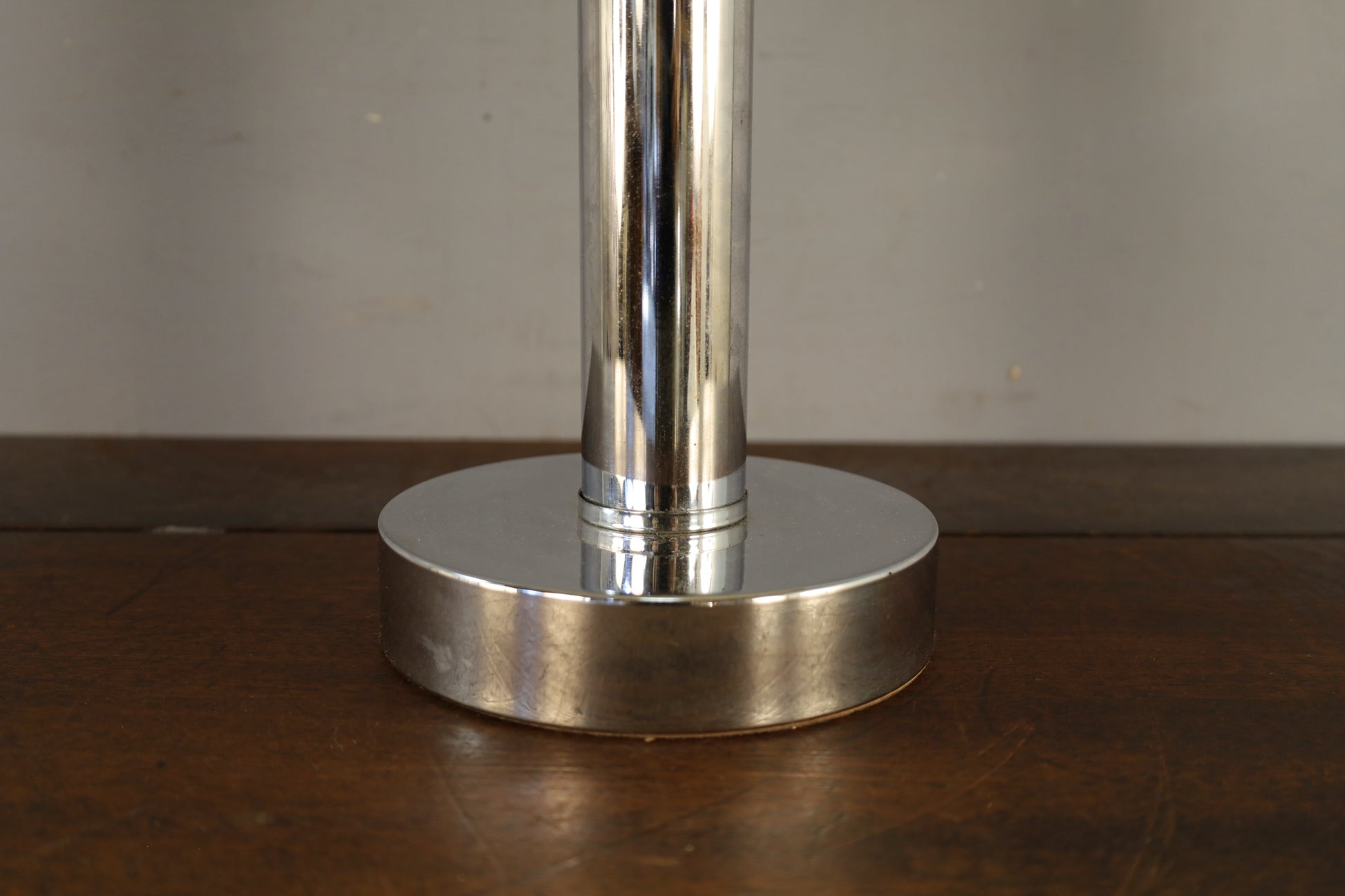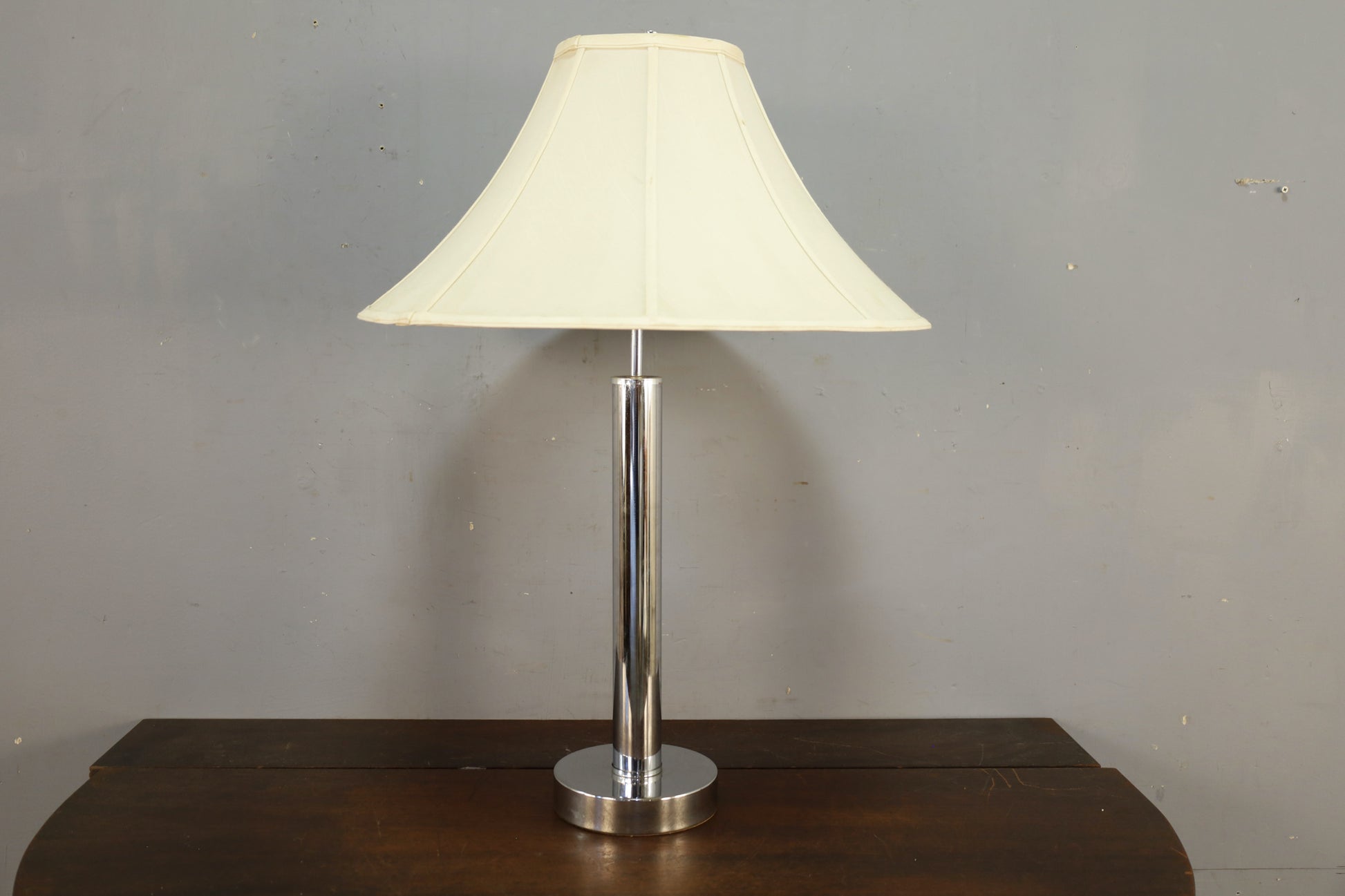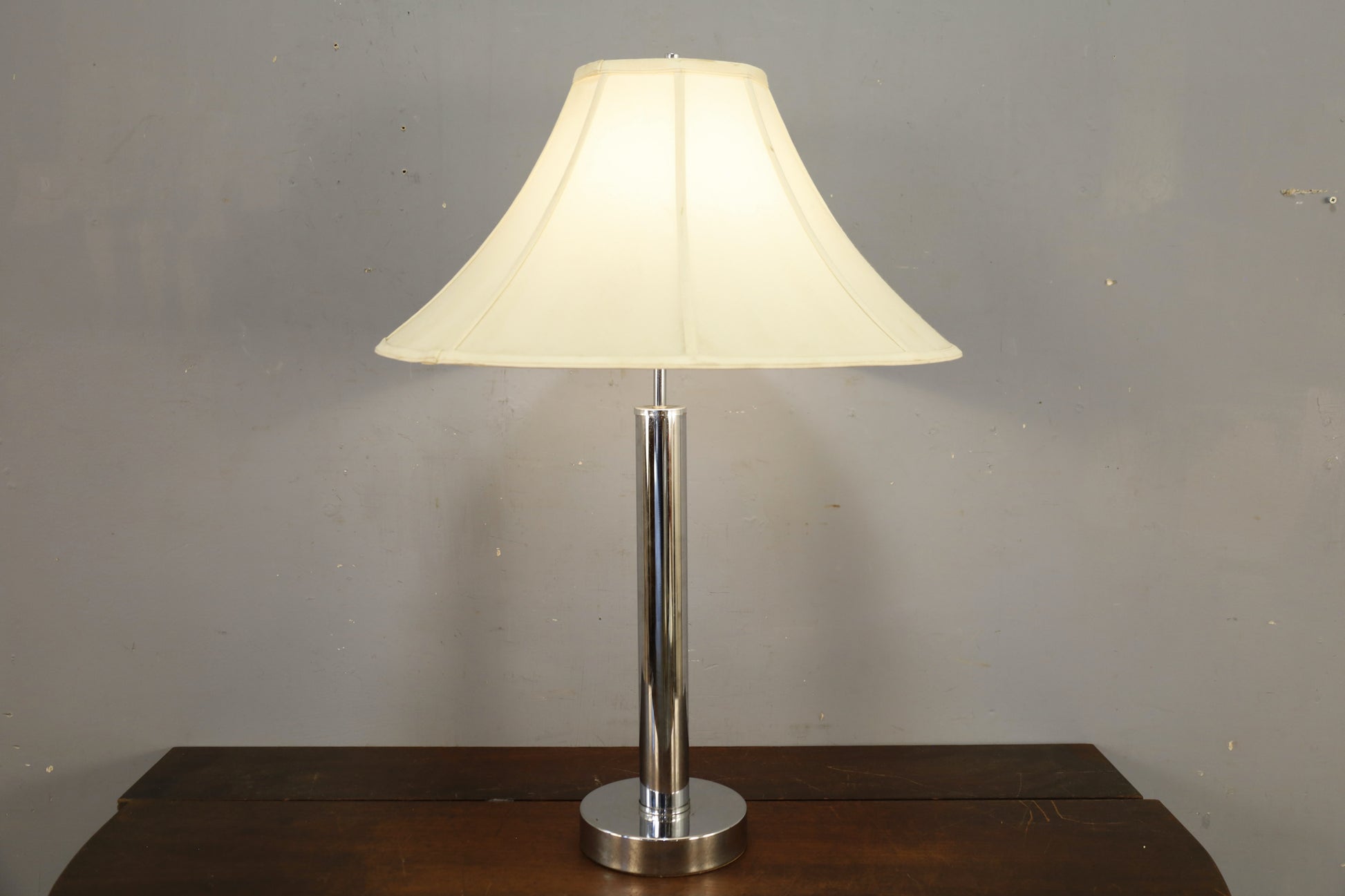As sleek as they come! Slim chrome neck and base. Flared cotton lamp. In good second-hand condition with minor aesthetic wear throughout. Lampshade has some light spots of discoloration from age.
