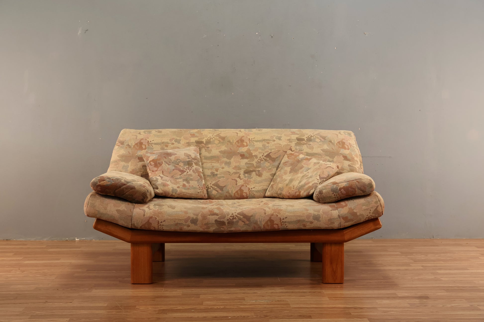 Stunning Danish teak gondola loveseat designed by Steen Burchardt-Nielsen in the 1970s. Features a warm teak frame that curves upward subtly at each end and muted abstract floral upholstery. In good condition, light wear.