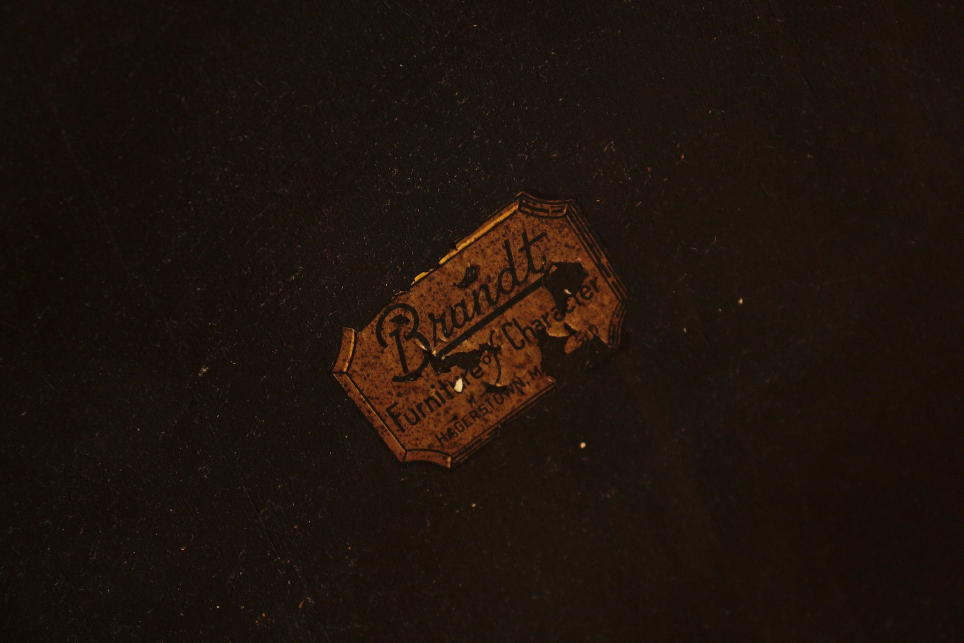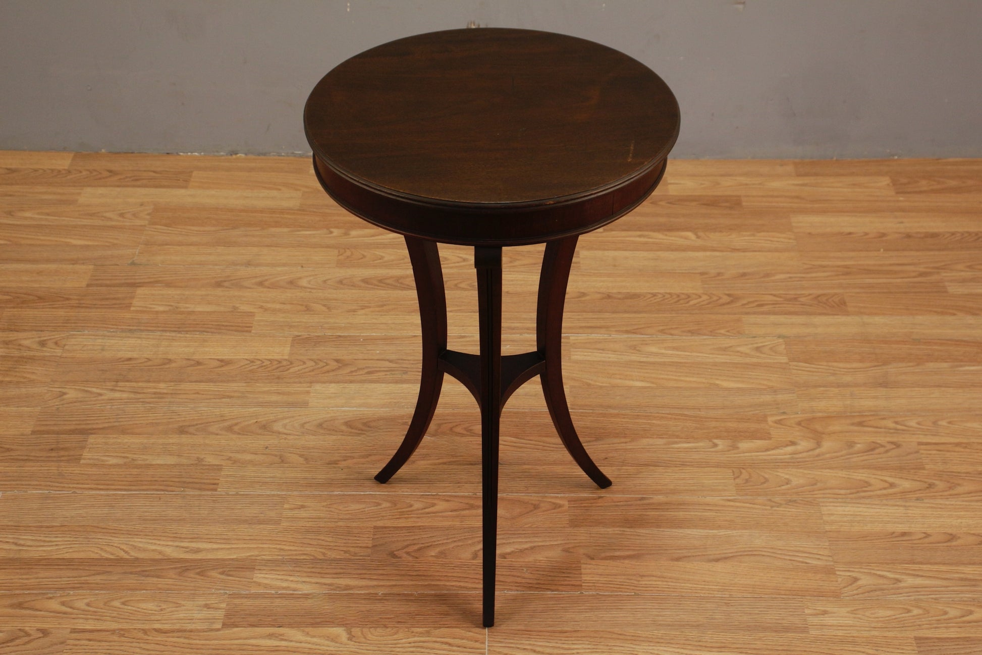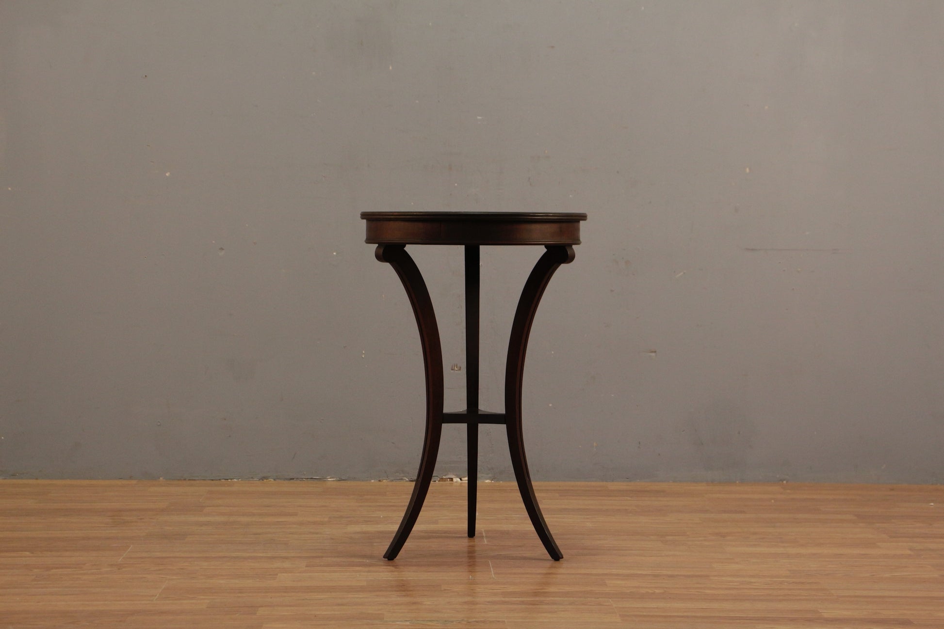 Stately dark mahogany occasional table. Manufactured by Brandt. Bowed legs. Nice dark wood finish. In generally good second-hand condition with some light surface wear throughout. Frame is wobbly when forced.