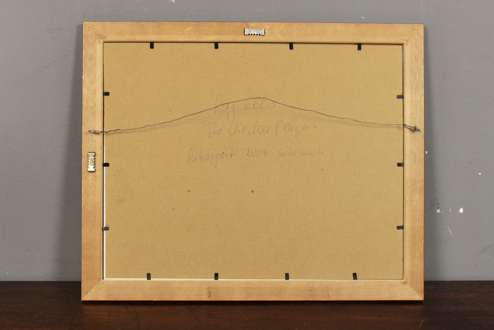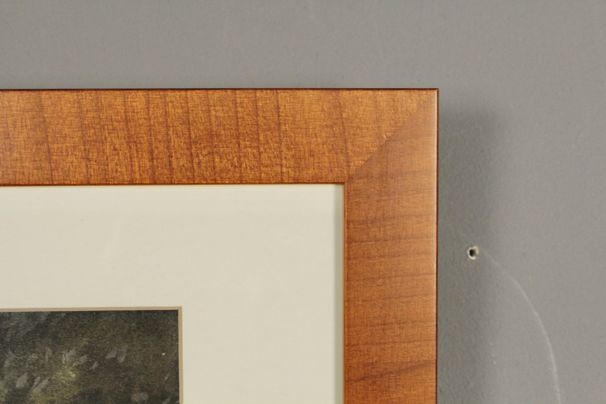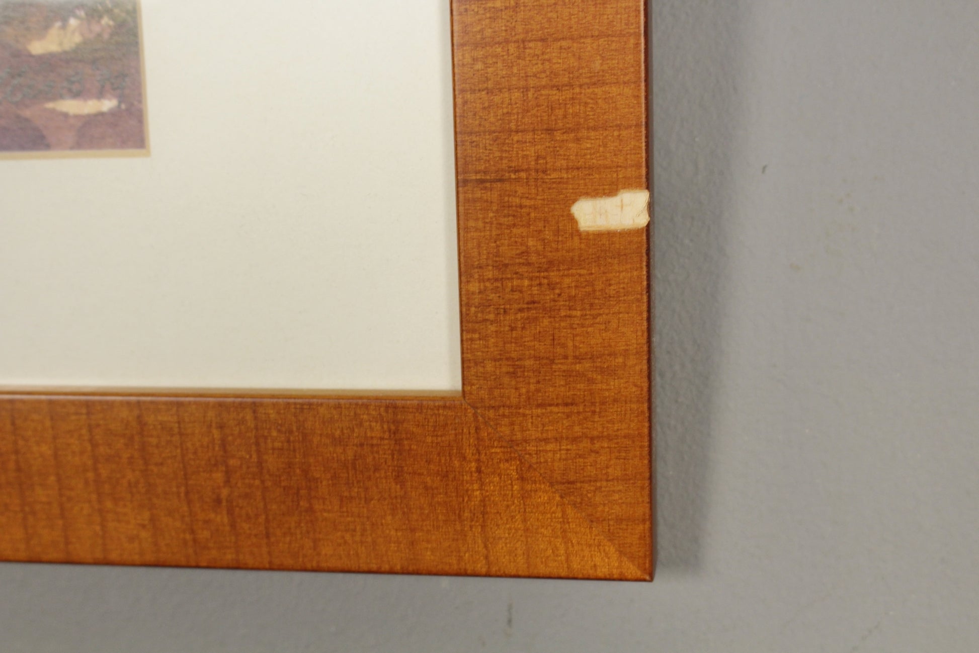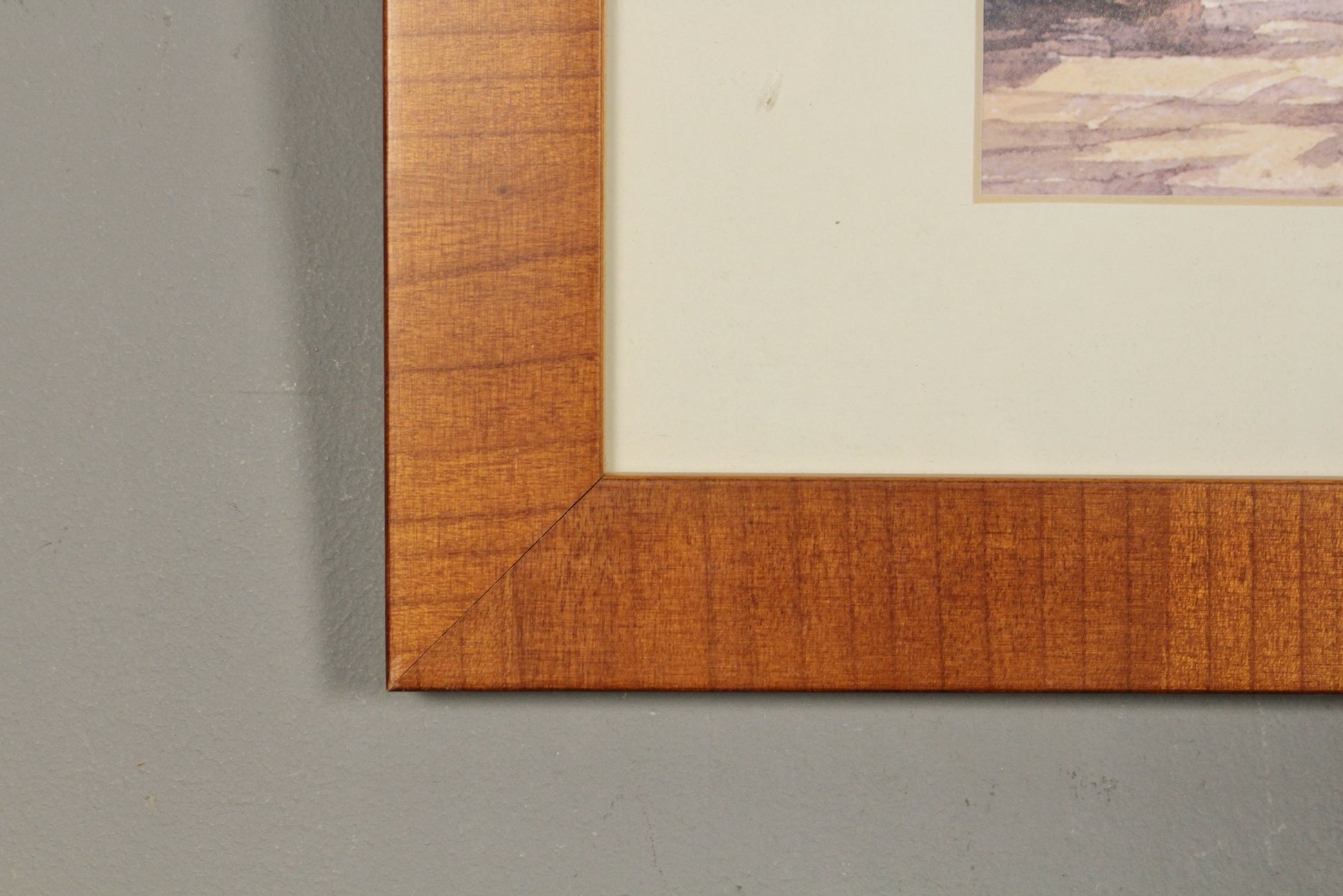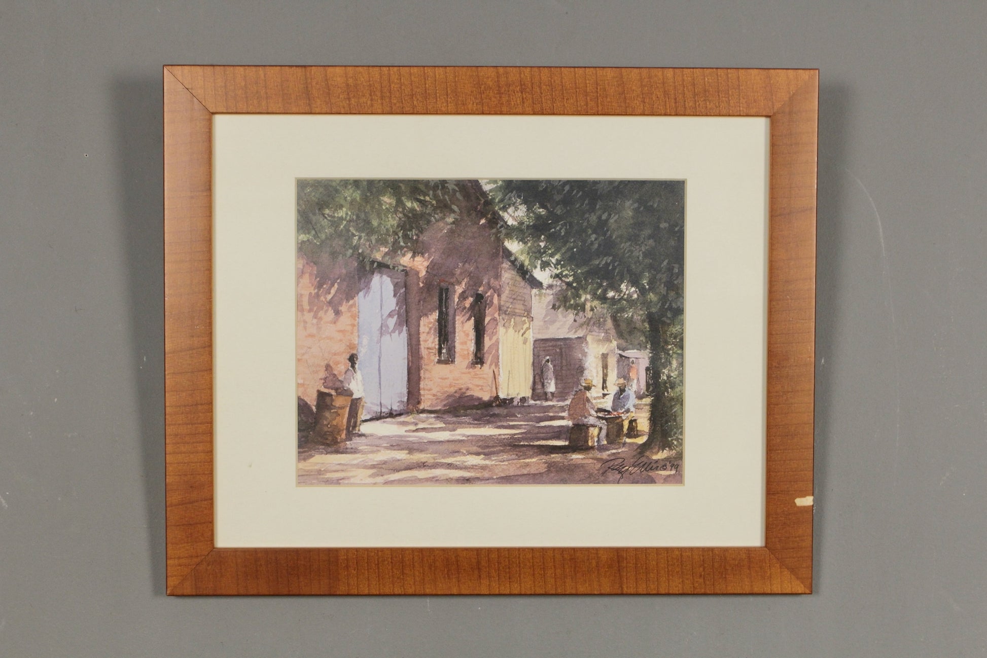 Serene painting of a shaded street in the neighborhood. Signed by the artist and held in a warm wooden frame signed Ray Ellis. In good condition, light surface wear with a small chip the the frame.