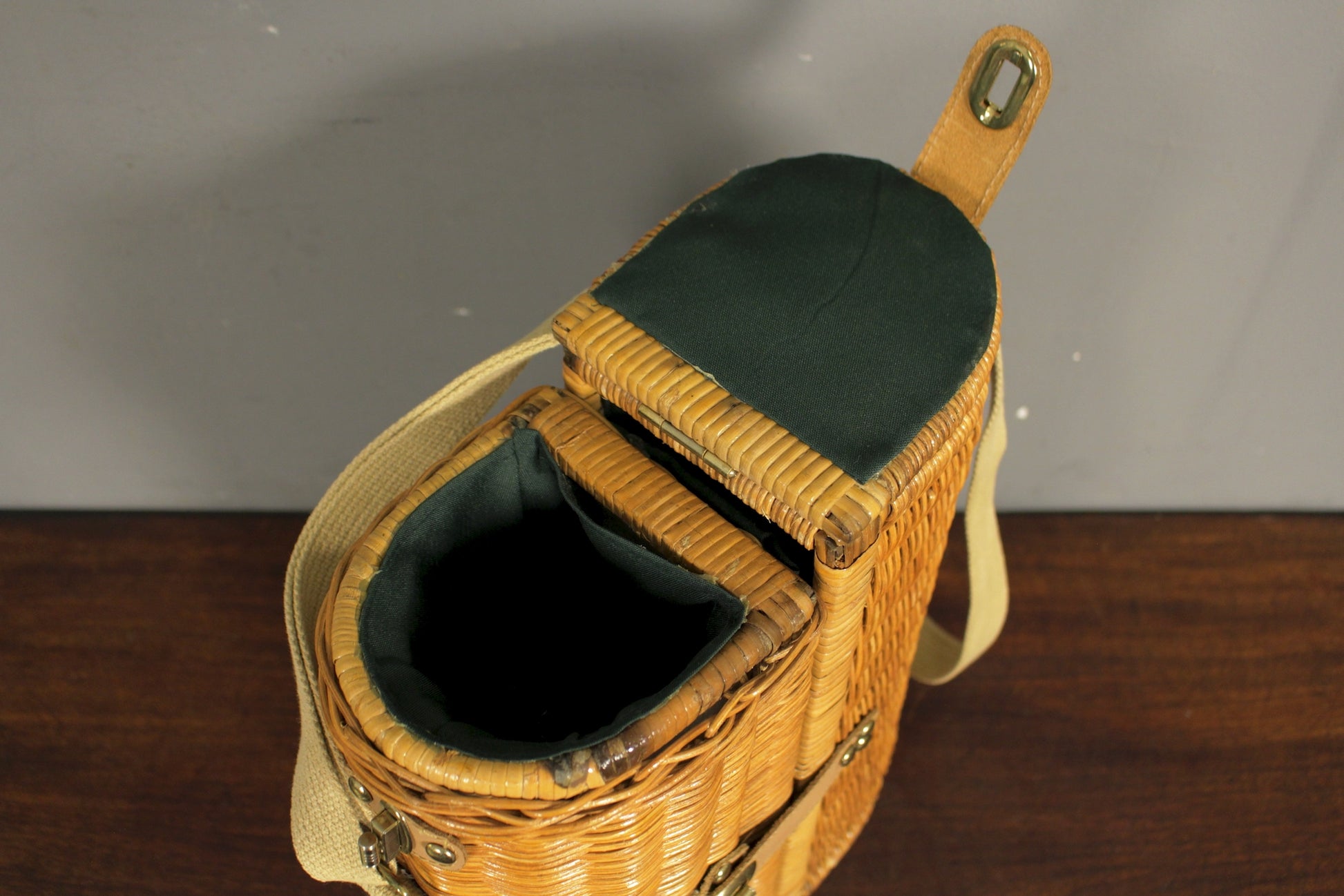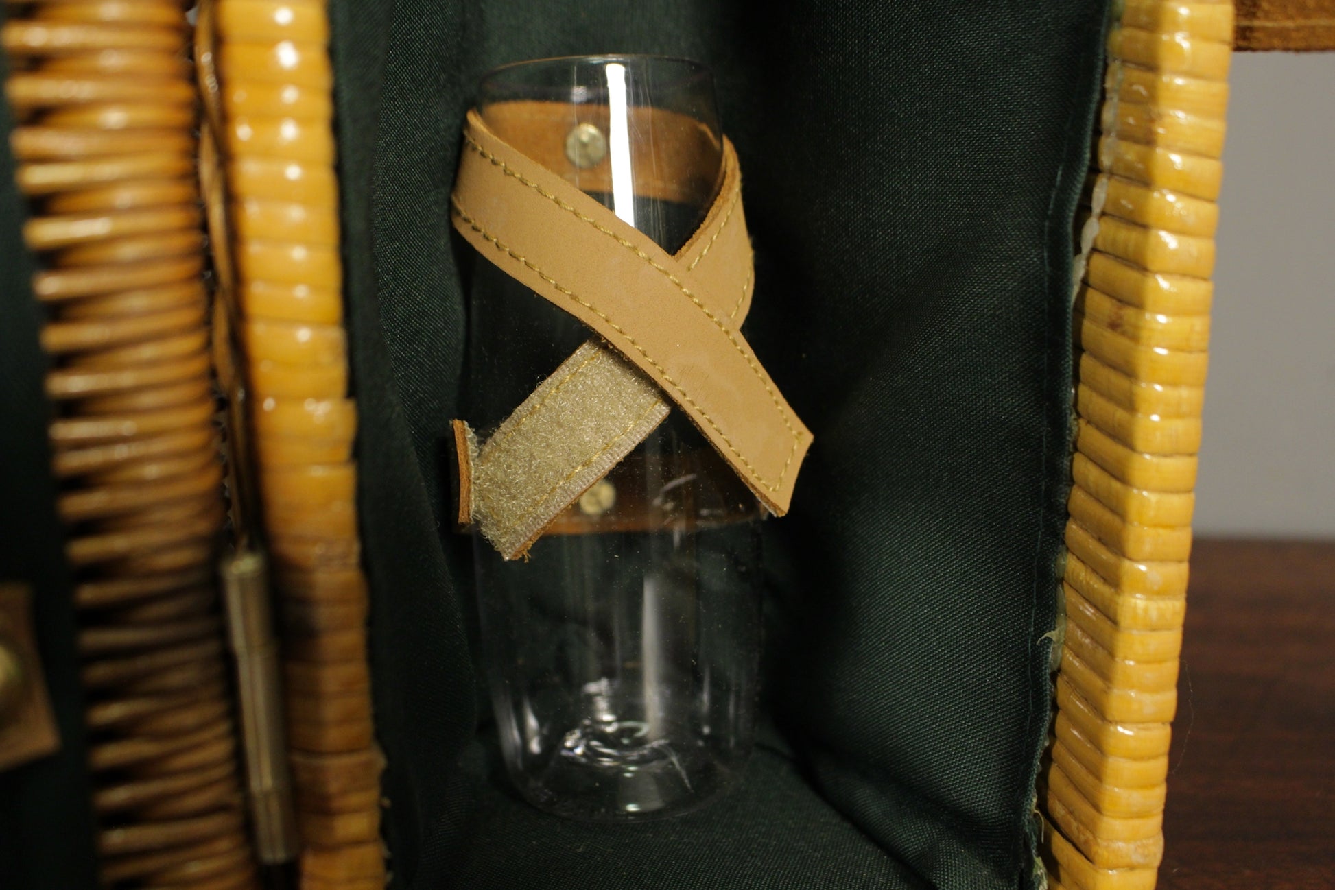 Handy wicker wine basket perfect for a sunny day in the park! Has a pouch for a bottle on one side, with a small compartment on the other side with two plastic wine glasses. Cheers! In good condition, light surface wear.