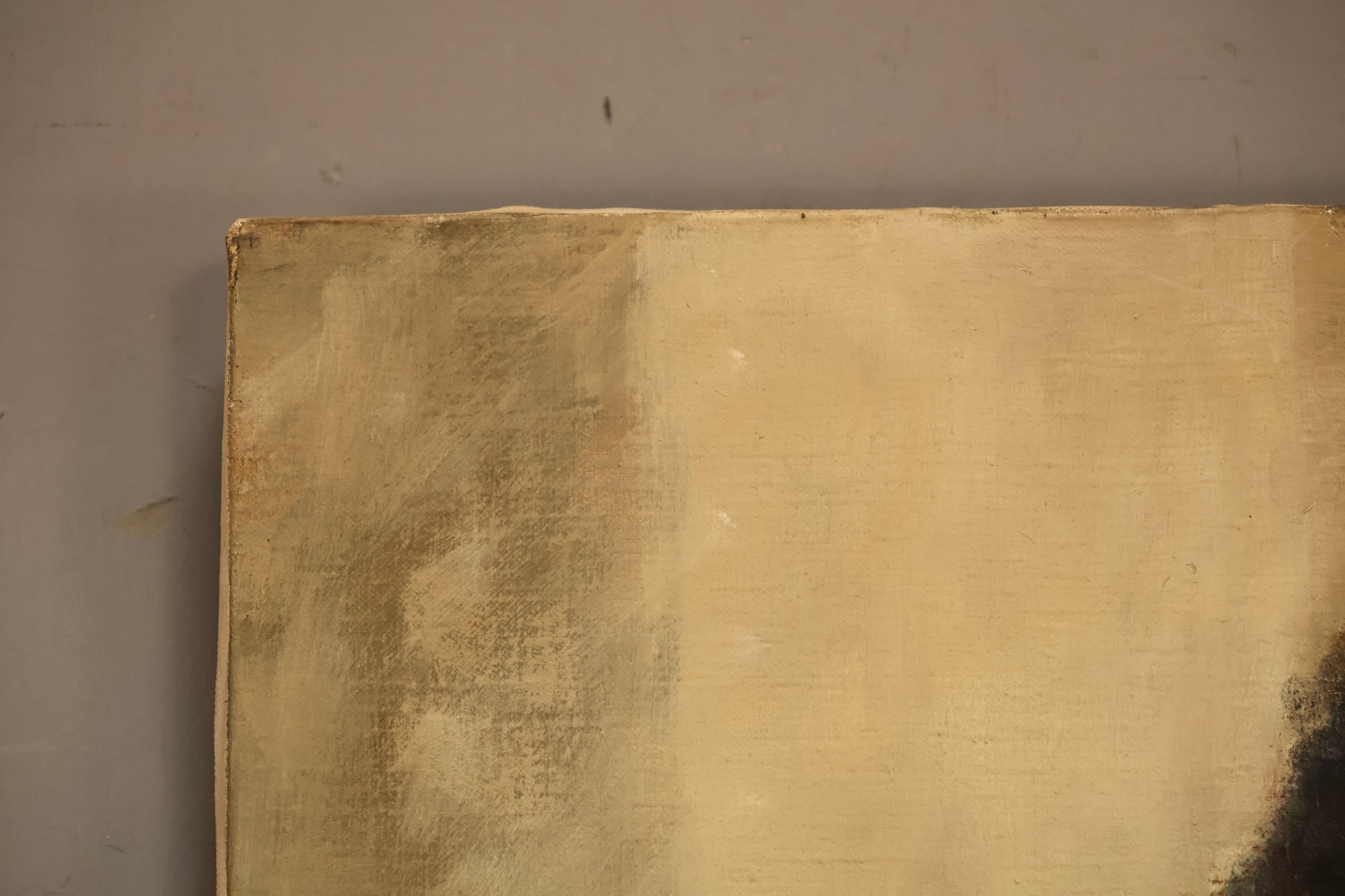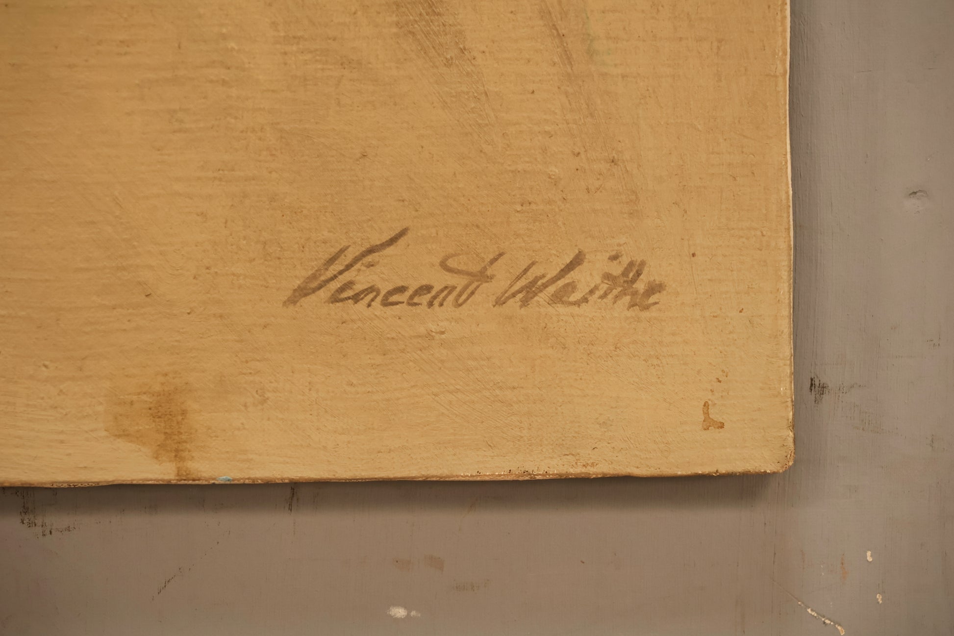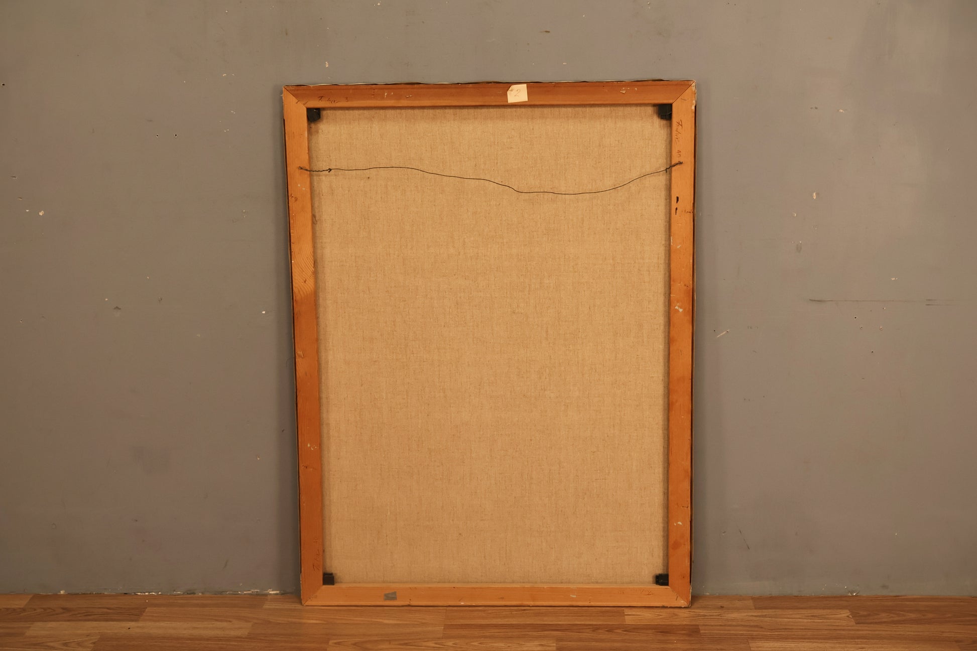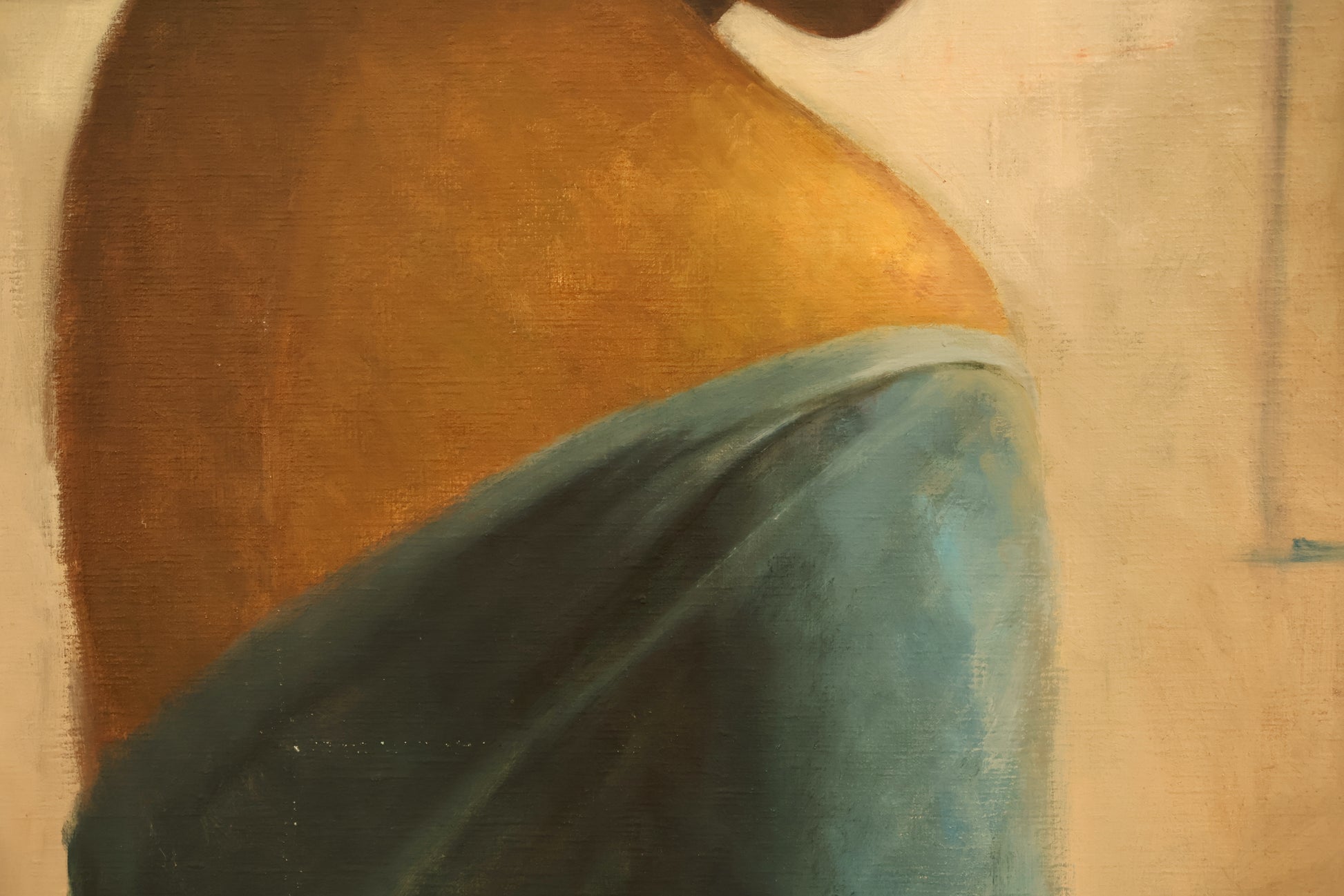 Tender portrait of a posed woman in blue. Features soft, feathered lines that echo the soothing color palette. Painted by Vincent Waithe. Does not have a frame but is wired to hang.